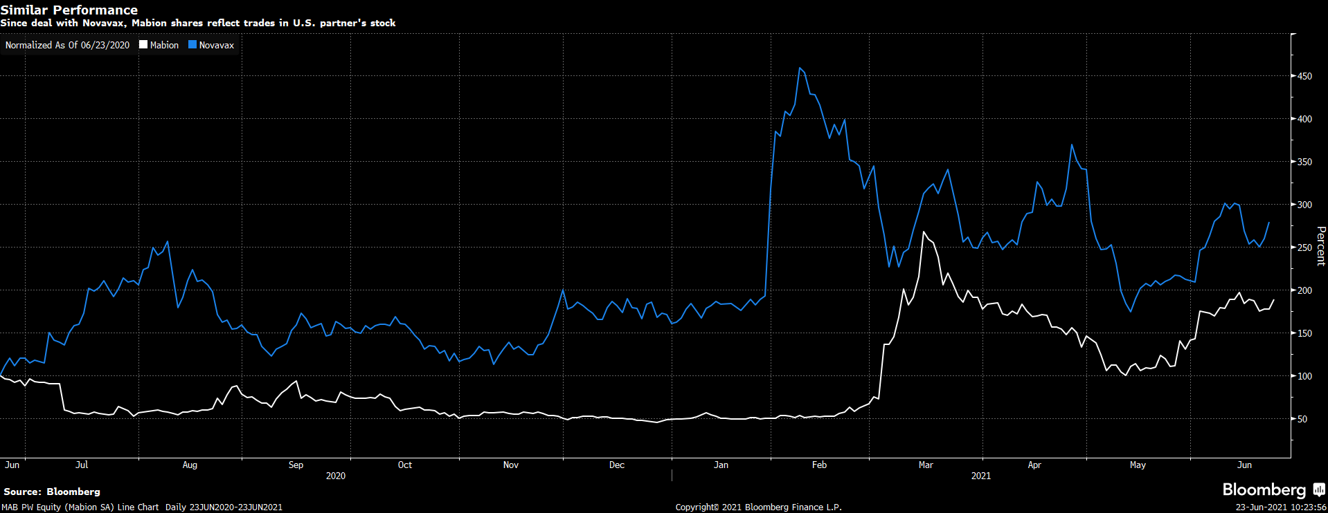 Mabion podążą za zmiennością cen akcji Novavax. Źródło: Bloomberg
