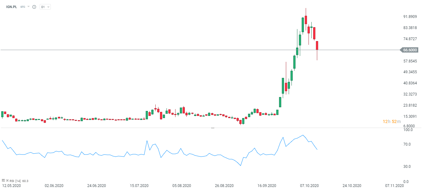 Akcje spółki Innogene tracą dzisiaj ponad 17%. Warto jednak zauważyć, że od końca września do szczytu spółka zyskała ponad 500%! Źródło: xStation5