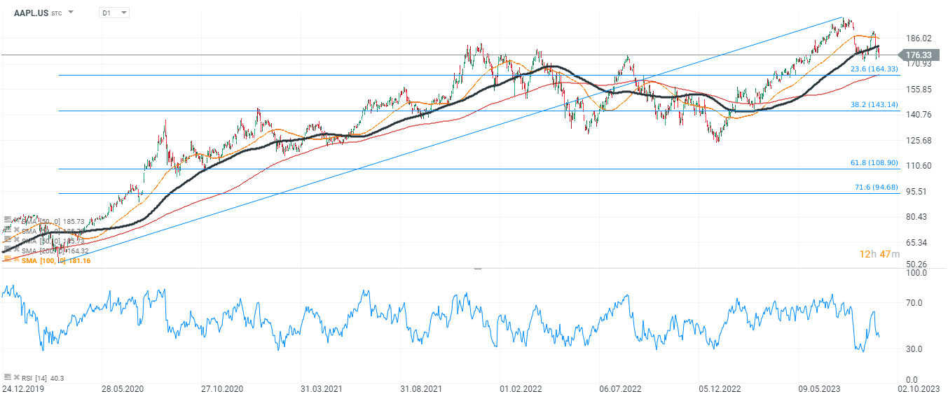 Wykres akcji Apple (AAPL.US), interwał D1. Pierwszym istotnym poziomem wsparcia w scenariuszu spadków wydają się okolice 165 USD gdzie widzimy 23,6 zniesienie fali wzrostowej z marca 2020 roku oraz decydującą średnią wyznaczającą umowny trend, SMA200 (czerwony kolor). Źródło: Platforma XTB