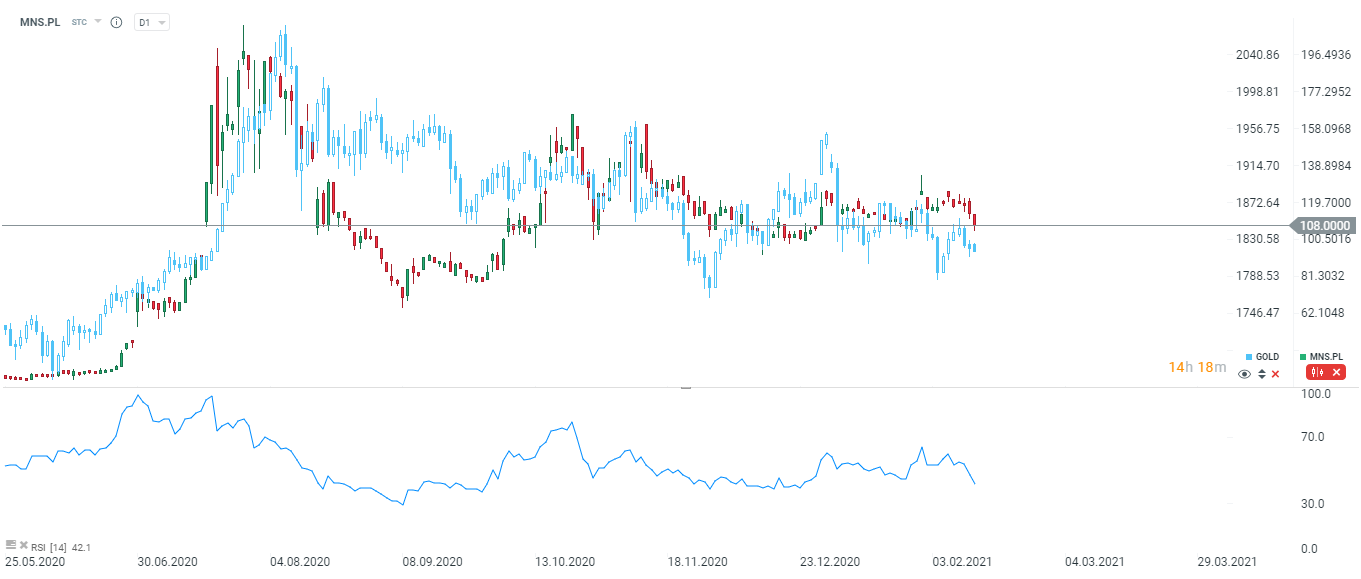 Zachowanie cen spółki Mennicy Skarbowej (MNS.PL) w dużej mierze zdeterminowane jest zachowaniem cen złota. Źródło: xStation5