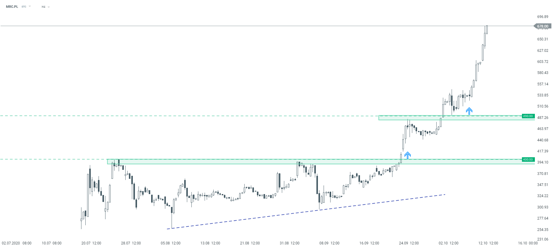 Patrząc na wykres, kurs znajduje się w bardzo silnym trendzie wzrostowym, dziś ponownie zostały ustanowione nowe rekordy. Mercator zyskał niemal 13% na wtorkowej sesji, a po publikacji szacunków za III kwartał niewykluczona jest kontynuacja rajdu podczas jutrzejszej sesji.