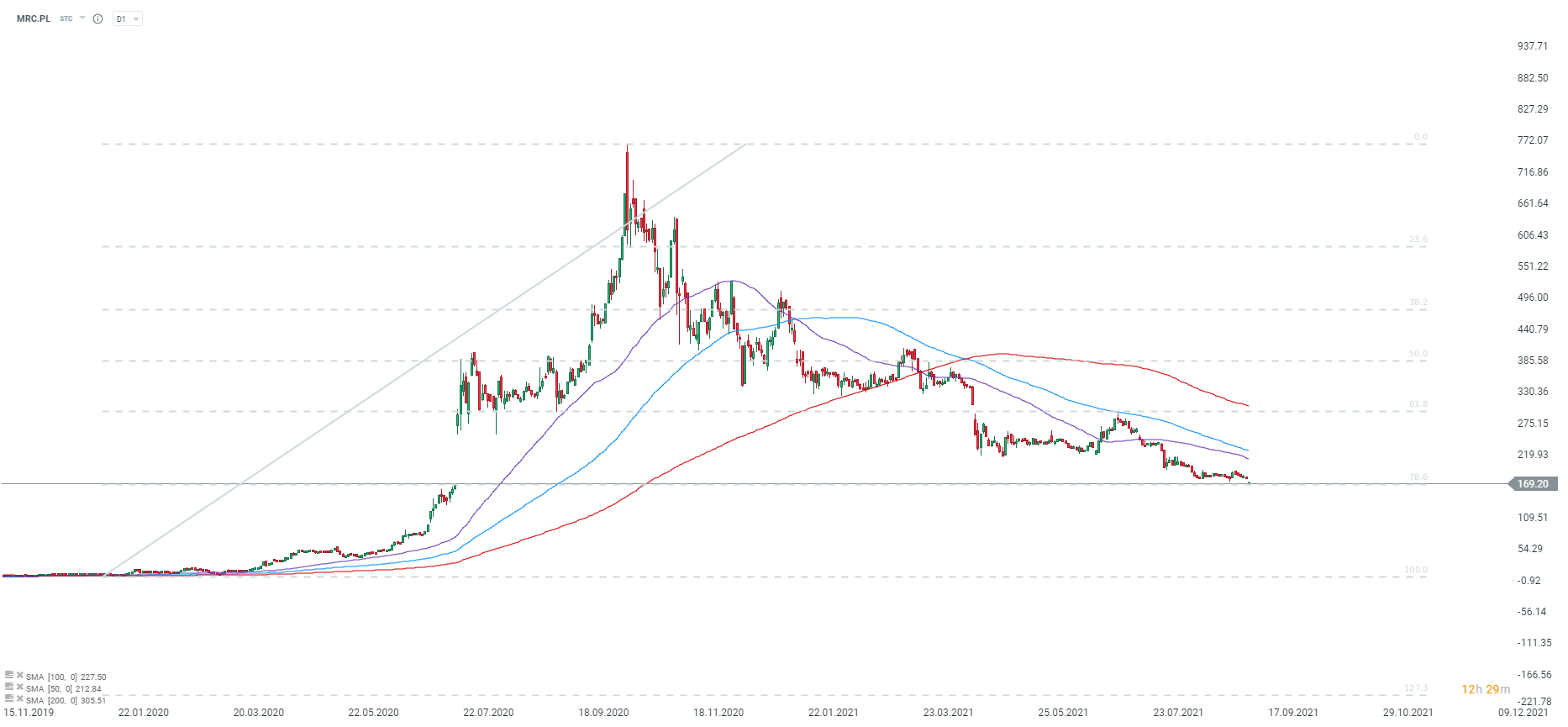 Akcje spółki spadły do zniesienia 78.6 całej fali wzrostowej z zeszłego roku. Otwierają się dokładnie w punkcie dolnego limitu ogromnej luki wzrostowej. Od początku roku akcje spółki straciły niemal 60%. Źródło: xStation5