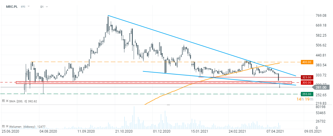Kurs Mercatora otworzył się dziś luką spadkową poniżej kluczowego poziomu 300 zł. W efekcie, cena znalazła się najniżej od sierpnia 2020. Gdyby wyprzedaż miała trwać dalej, ważnym wsparciem wydaje się poziom 255 zł (dzienne minima z lata 2020). Kolejne ważne poziomy cenowe znajdują się dopiero poniżej bariery 200 zł. Celem dla strony kupującej byłby z kolei powrót powyżej 300 zł.