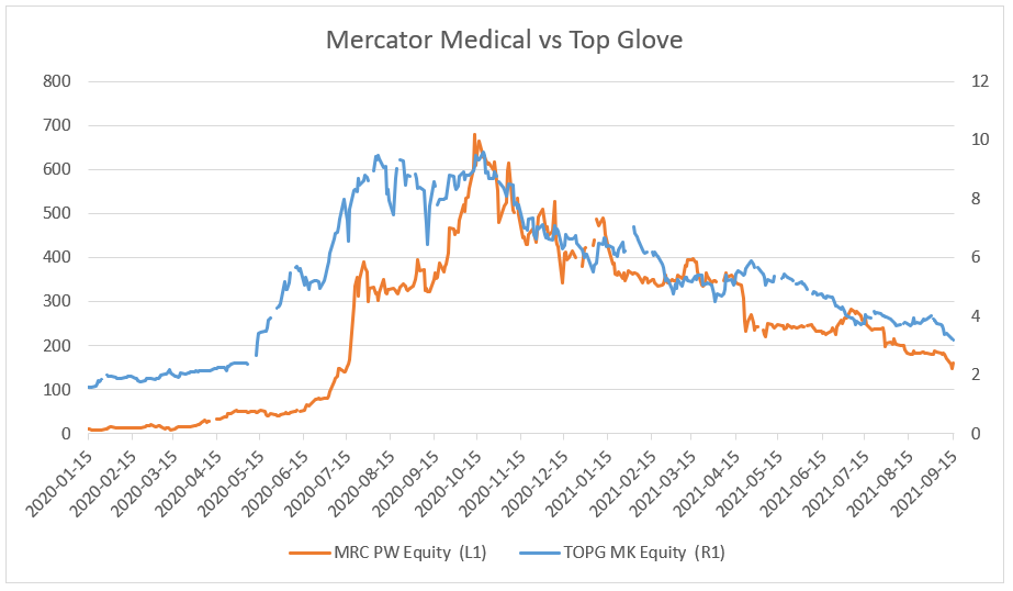 Porównując notowania Mercatora do Top Glove (największy producent rękawic na świecie), widać, że w obu przypadkach spółki przystąpiły do wyraźnego trendu spadkowego. Presja na spadek cen rękawic (i spadek marż) wyraźnie ciąży producentom. Źródło: Bloomberg, XTB