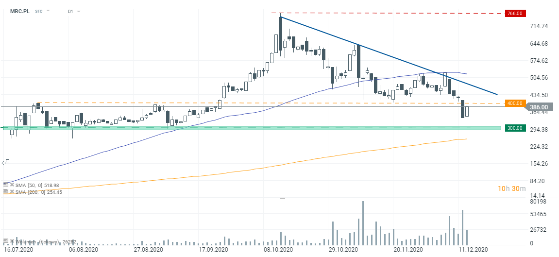 Cena akcji Mercator Medical (MRC.PL) rośnie obecnie o blisko 13% i zbliża się do bariery 400 zł. Od połowy października dominuje jednak tendencja spadkowa, co ma związek z doniesieniami na temat szczepionek. Wczorajsze minimum wyniosło 340 zł i były to poziomy najniższe od września. W przypadku przejęcia kontroli przez stronę podażową, potencjalnie ważnym wsparciem może być bariera 300 zł. Źródło: xStation5