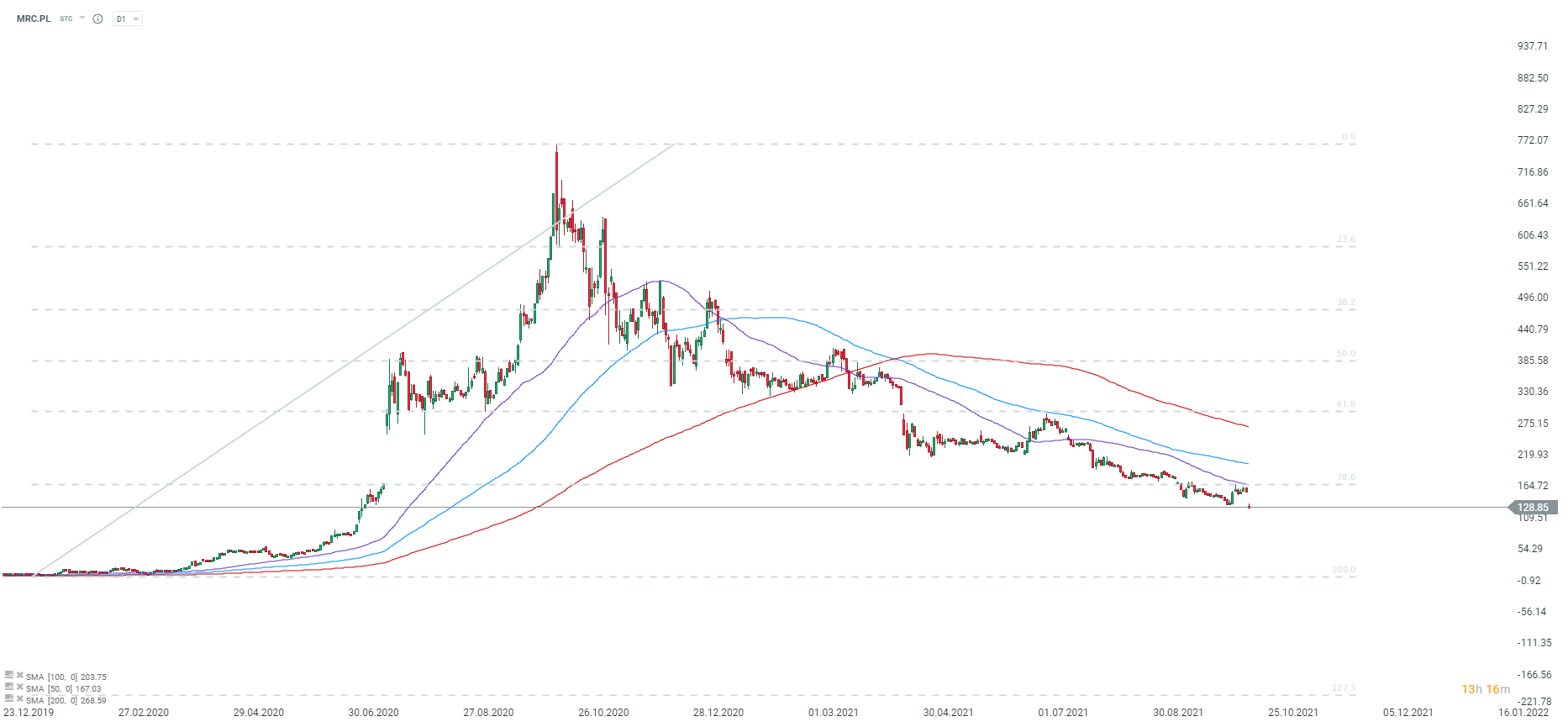 Mercator Medical (MRC.PL) otwiera się rzisiaj potężną luką spadkową, która wynosi niemal 20%. Z perspektywy długoterminowej spadek nie wygląda drastycznie, ale jest to jednak niemal 30 zł na akcji. Cena spadła do najniższego poziomu od połowy zeszłego roku. To efekt wyników finansowych spółki.