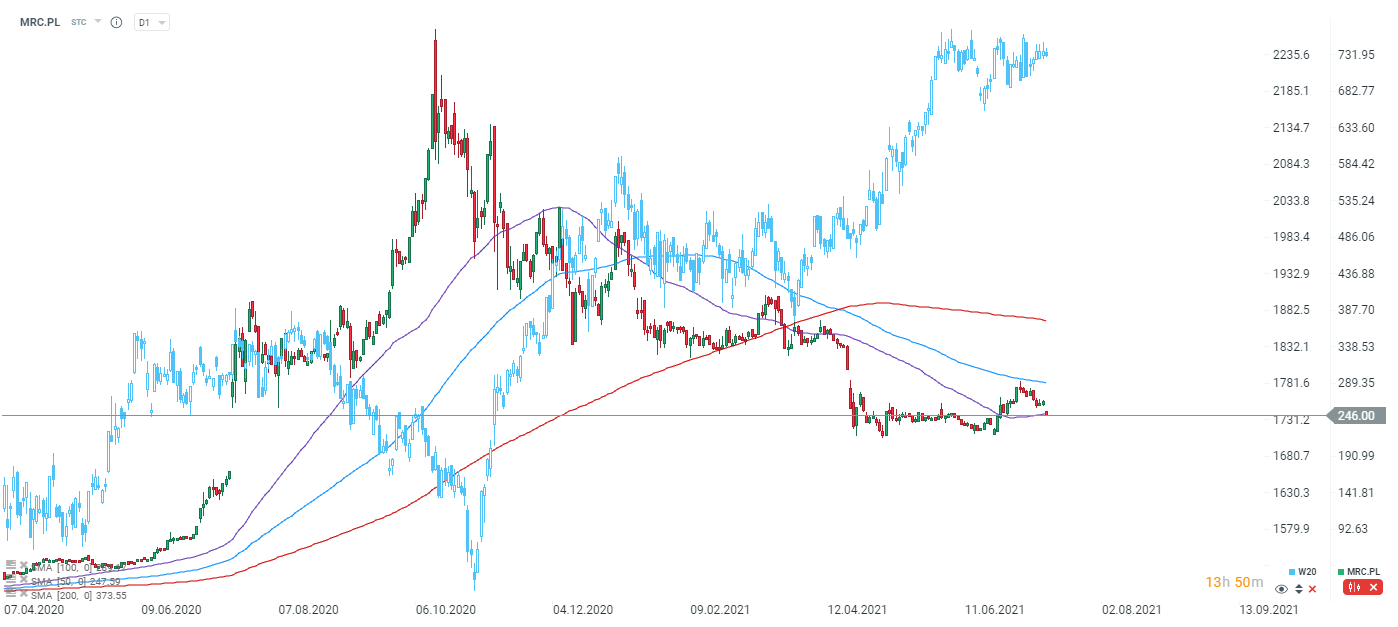Mercator traci na otwarciu ponad 6% po publikacji wyników za II kwartał 2021 roku. Mercator (MRC.PL_ pokazuje zysk EBITDA na poziomie ok. 165 mln zł, co jest spadkiem o 30% w stosunku do analogicznego okresu rok wcześniej. Zysk netto to 146,6 mln zł, przy podobnym spadku na poziomie 30% r/r). Przychody to 535,5 mln, co jest wzrostem na poziomie 43% r/r. Spadek zysków przy wzroście przychodów to oczywiście efekt spadku cen. Spółka informuje jednak, że zyski byłyby większe o ok. 55 mln zł, gdyby dane zostały dostosowane przez zawiązanie "rezerw na wartość towarów kupionych po cenach wyższych niż obecne możliwe do uzyskania ceny sprzedaży".
