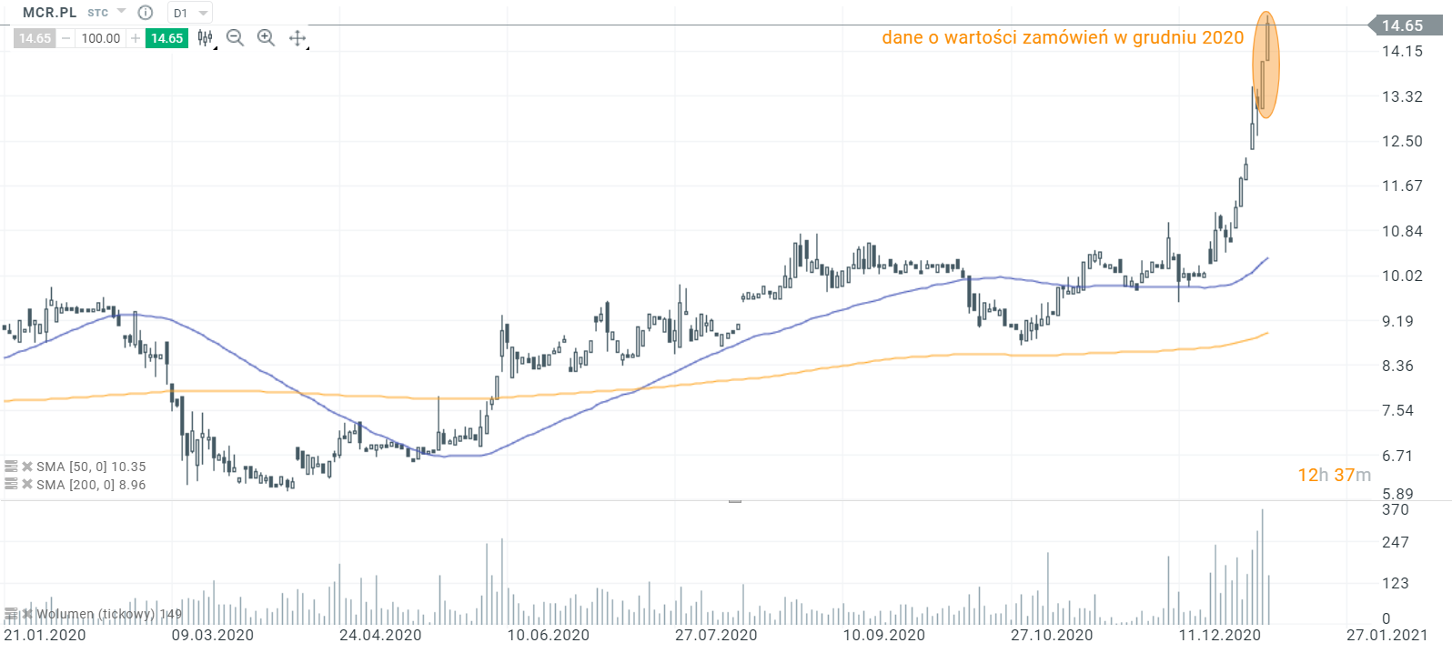 Kurs spółki Mercor wzrósł o około 10% od momentu publikacji mocnych danych o zamówieniach. W ostatnich dniach widać wyraźne zainteresowanie spółką, o czym świadczy chociażby wysoki wolumen. Jeszcze w połowie grudnia jedna akcja wyceniana była na 10 zł, obecnie jest to już ponad 14,50 zł. Źródło: xStation5