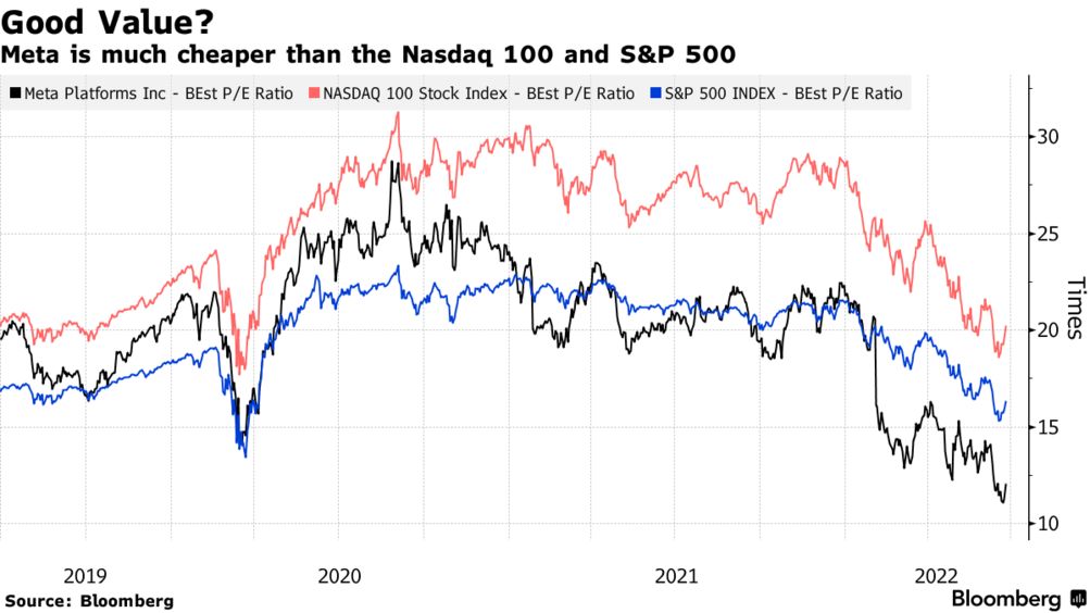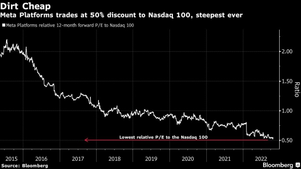 Wskaźnik ceny do zysku dla Meta Platforms jest obecnie rekordowo niski w relacji do średniego c/z indeksu NASDAQ, wobec którego notowany jest z ponad 50% dyskontem. Źródło: Bloomberg