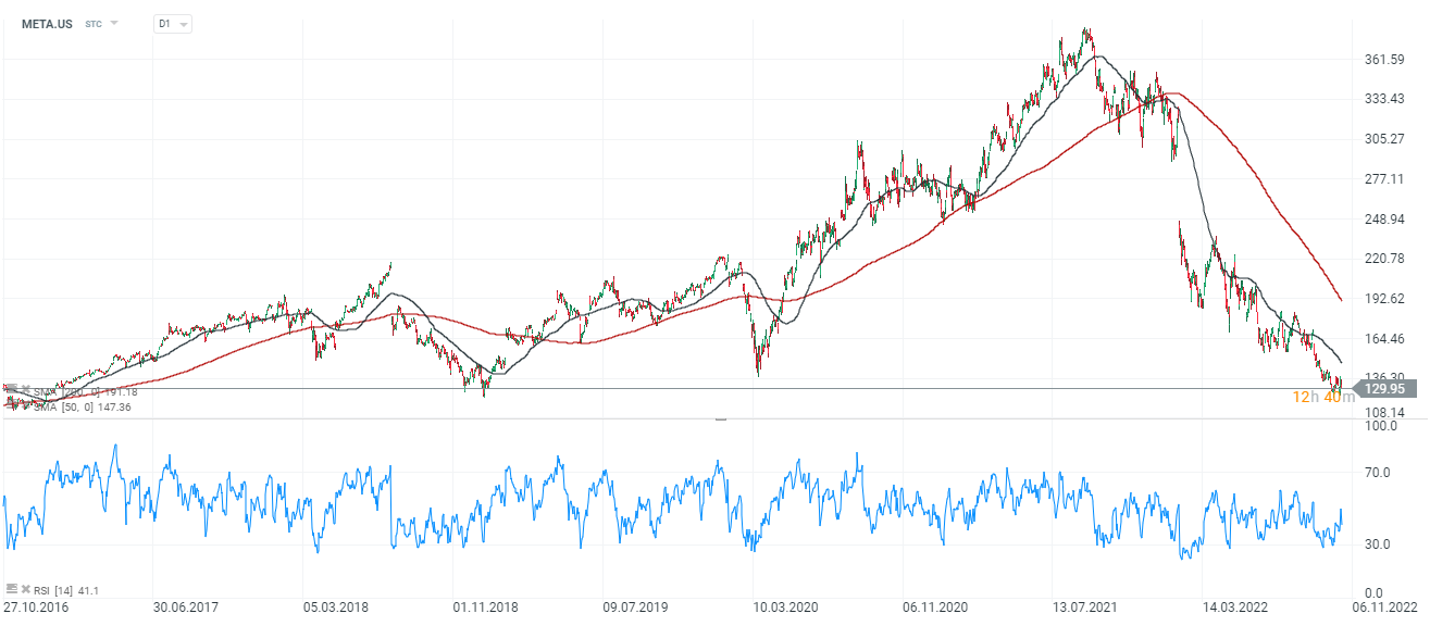 Wykres Meta Platforms (META.US), interwał D1. Łączny spadek kapitalizacji przed otwarciem po wczorajszym raporcie sięga już blisko 65 mld USD, handel przedsesyjny sugeruje otwarcie w okolicach 108 USD. Cena porusza się niezmiennie w trendzie spadkowym po tym jak na początku roku obserwowaliśmy przecięcie średnich SMA200 i SMA50 wg. analizy technicznej zwane 'krzyżem śmierci'. Jeśli akcje otworzą się poniżej 110 USD spadek osiągnie poziom niewidziany od 6 lat. W tym samym czasie jednak ilość użytkowników Facebooka wzrosła o blisko 60%, a ilość użytkowników Instagrama o setki procent. Istnieje szansa, że 'Wall Street' przesadziło z wyprzedażą, a walory odbiją jak klimat inwestycyjny zacznie się poprawiać i firmy znów zwiększą wydatki na reklamę. Źródło: xStation5