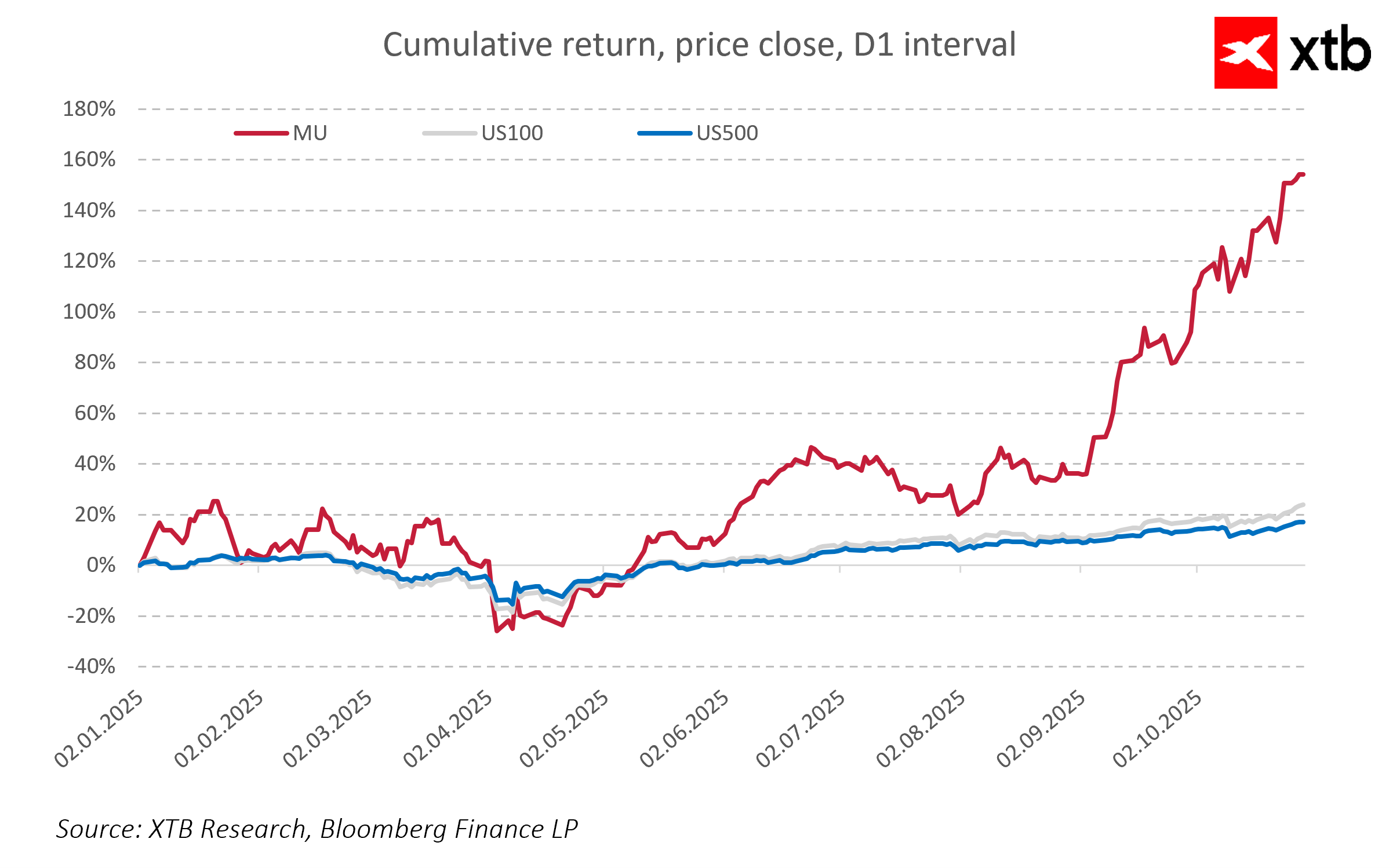 Obecny klimat rynkowy sprzyja producentom pamięci o wysokiej przepustowości, ponieważ rozwój sztucznej inteligencji, Big Data i zaawansowanych aplikacji znacząco zwiększa popyt. Ograniczona podaż oraz wysokie bariery wejścia działają na korzyść liderów rynku, pozwalając im zwiększać udziały i utrzymywać przewagę konkurencyjną. Od początku roku akcje Micronu rosły znacznie mocniej niż indeks S&P 500, co dodatkowo podkreśla optymizm inwestorów wobec perspektyw spółki.