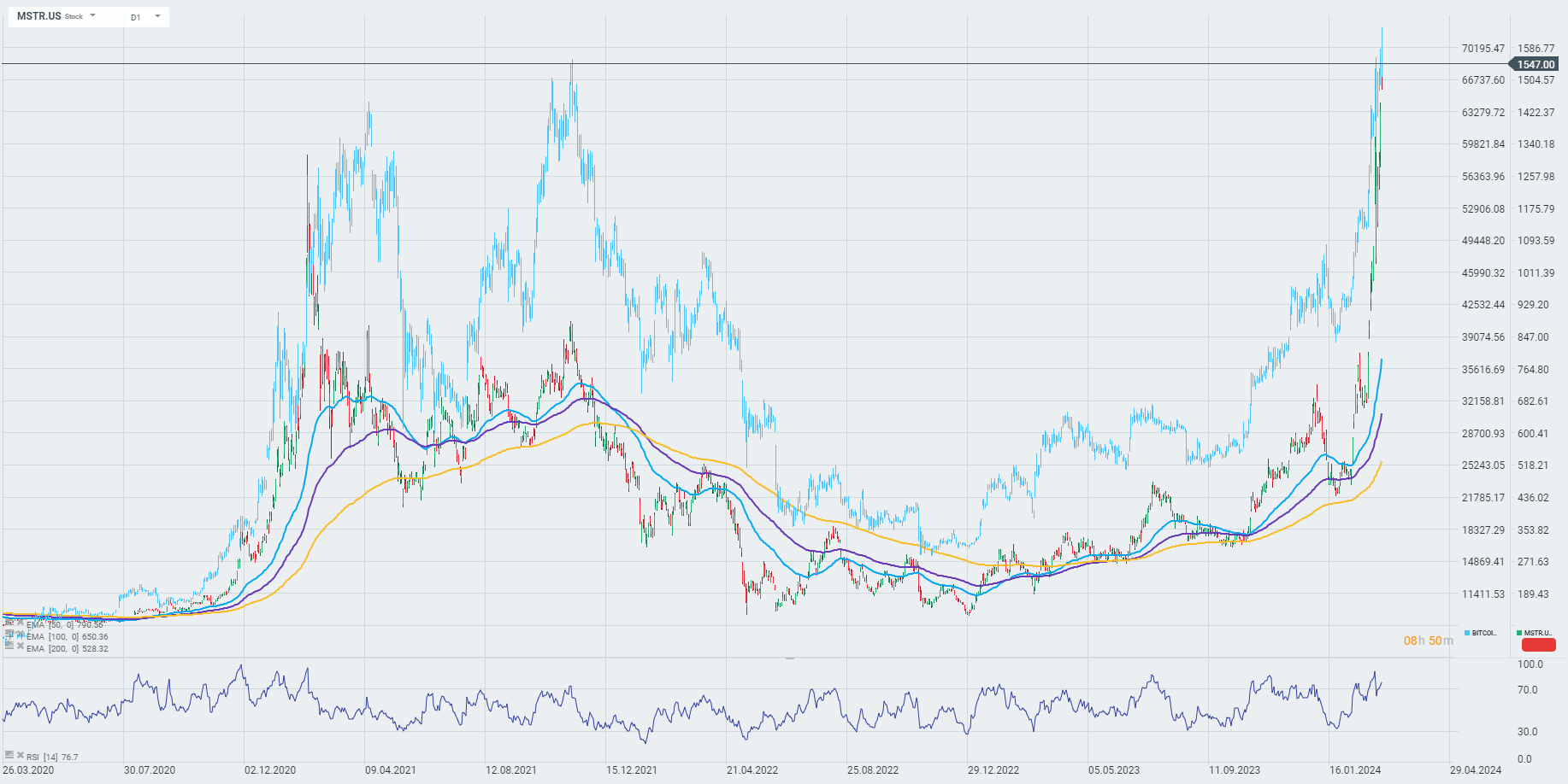Akcje MicroStrategy (MSTR.US) zyskują prawie 8,5% na początku poniedziałkowej sesji. W miarę jak spółka zwiększa swoją ekspozycję na rynek kryptowalut, ceny jej akcji stają się coraz bardziej skorelowane z ceną BTC. W rezultacie kapitalizacja rynkowa spółki staje się mniej zależna od jej głównych obszarów działalności sprzed kilku lat, którymi były rozwiązania i usługi IT, Cloud oraz Business Intelligence.