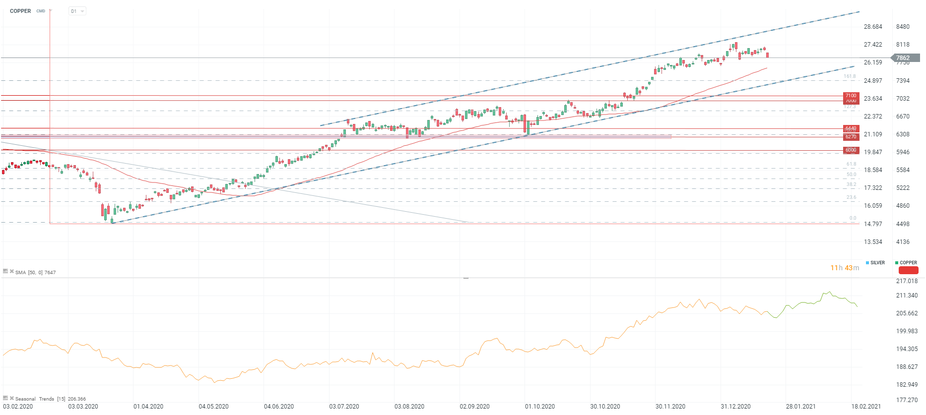 Warto zauważyć, że cena znajduje się najniżej od 11 stycznia i nie doszło w ostatnim czasie do wyznaczenia nowego wyższego szczytu. Dopiero przebicie dołka z 11 stycznia dawałoby nowy niższy dołek, co mogłoby przedłużyć korektę w okolice 7600, czyli do 50 dniowej średniej. Kluczowe wsparcie w okolic 7400, gdzie znajduje się dolne ograniczenie wzrostowego kanału trendowego oraz zniesienie 161.8 cofnięcia z początku pandemii. Warto również zauważyć, że sezonowość zakłada lokalny dołek w najbliższych dniach. Źródło: xStation5