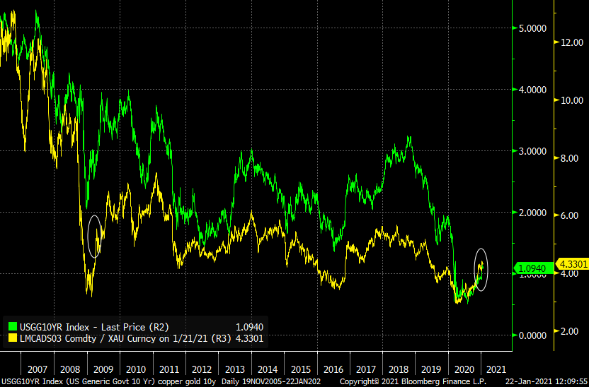 Stosunek cen miedzi do złota dalej rośnie, po niewielkim cofnięciu w poprzednich dniach. Jak widać bardzo podobna sytuacja miała miejsce w 2009 roku. W dalszej części tego roku stosunek cen wzrósł w ponad 6! Potwierdzeniem takiego trendu byłby dalszy wzrost rentownośći w Stanach Zjednoczonych, ktory w ostatnim czasie nieco przyhamował. Źródło: Bloomberg
