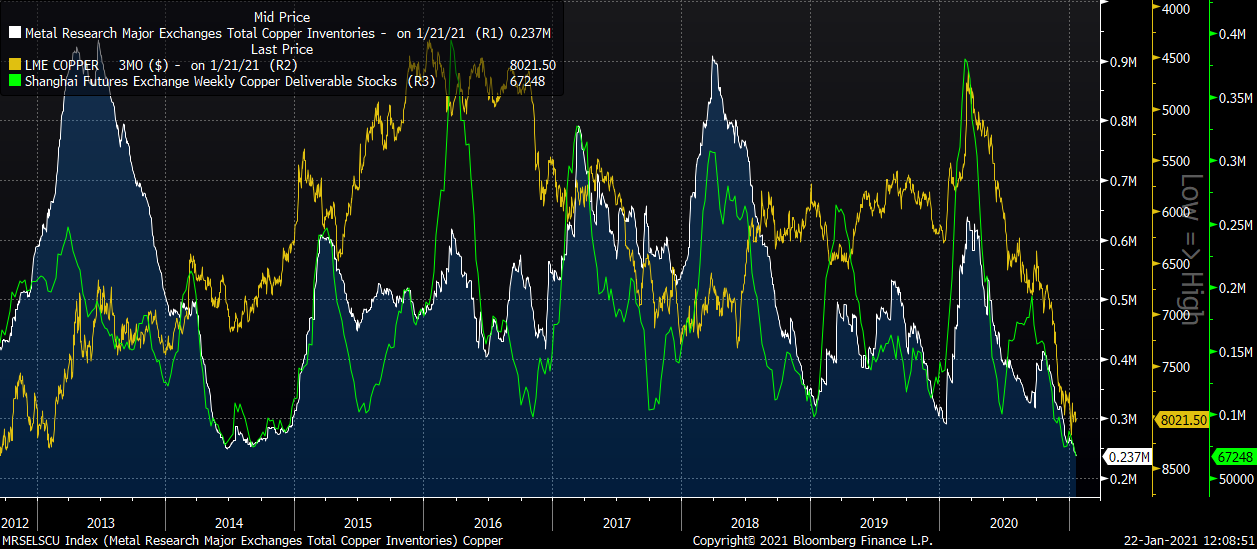 Co ciekawe na giełdach widać dalszy spadek zapasów tego surowca. Zapasy na giełdach światowych oraz w Shanghaju przebiły dołki z 2014 roku. Źródło: xStation5