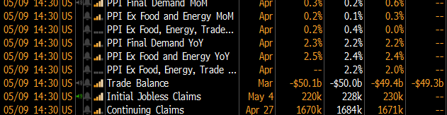 Dzisiaj opublikowane zostały dane drugiego rzędu z USA. Claimsy wypadły na poziomie 228 tys. przy oczekiwaniu spadku do 215 tys. z poziomu 230 tys. Inflacja PPI pozostaje na poziomie 2,2% r/r za kwiecień, pomimo oczekiwania odbicia do 2,3% r/r. Inflacja PPI w ujęciu miesięcznym rośnie o 0,2% m/m, zgodnie z oczekiwaniami po 0,6% m/m w marcu. Inflacja bazowa również rozczarowuje. Z kolei w Kanadzie deficyt spada mniej od oczekiwań. Mamy za to zarówno wzrost eksportu oraz importu.