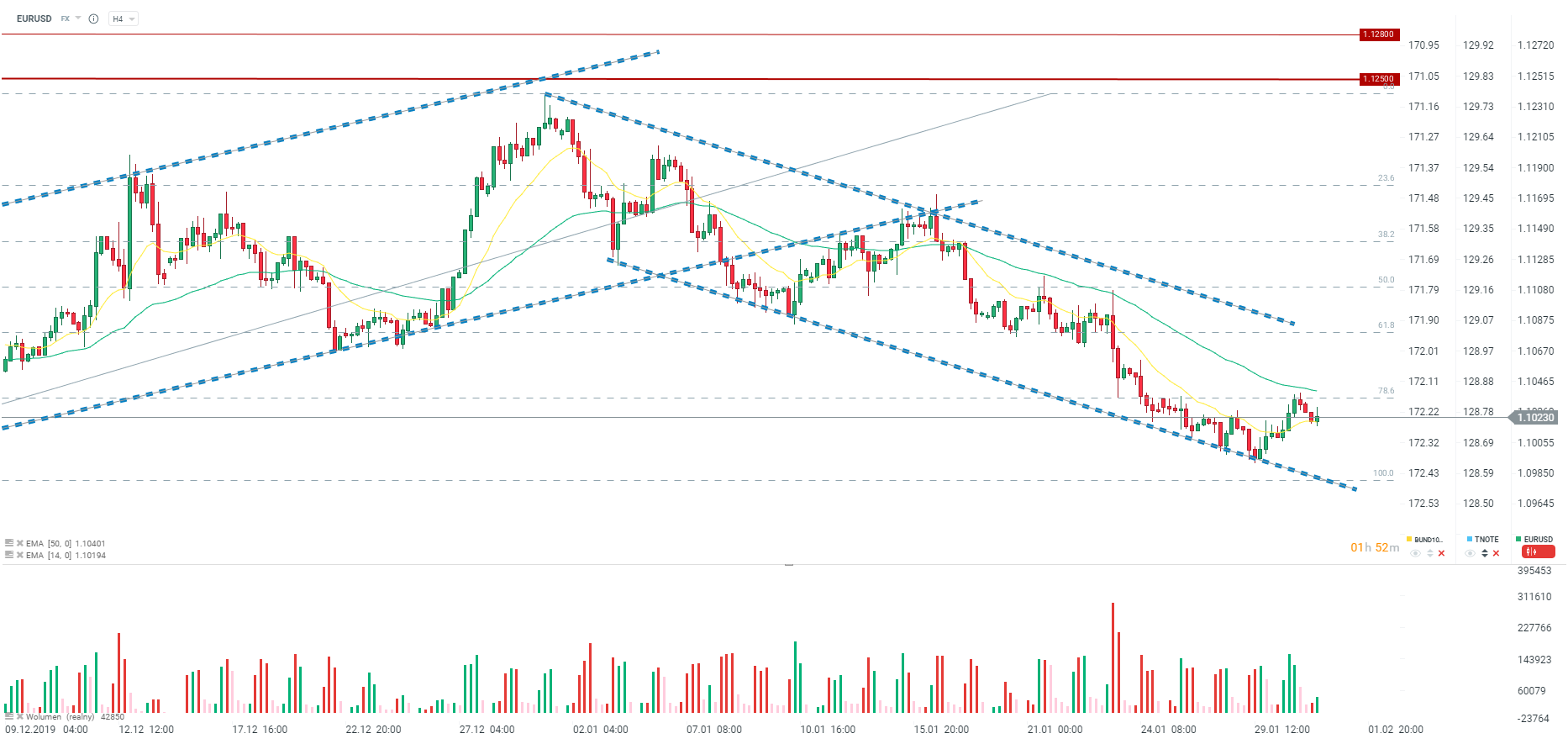 Euro tymczasem ogranicza swoje odbicie, ale wciąż utrzymujemy się wyraźnie powyżej poziomu 1,1000 oraz powyżej 14 okresowej średniej. Źródło: xStation5
