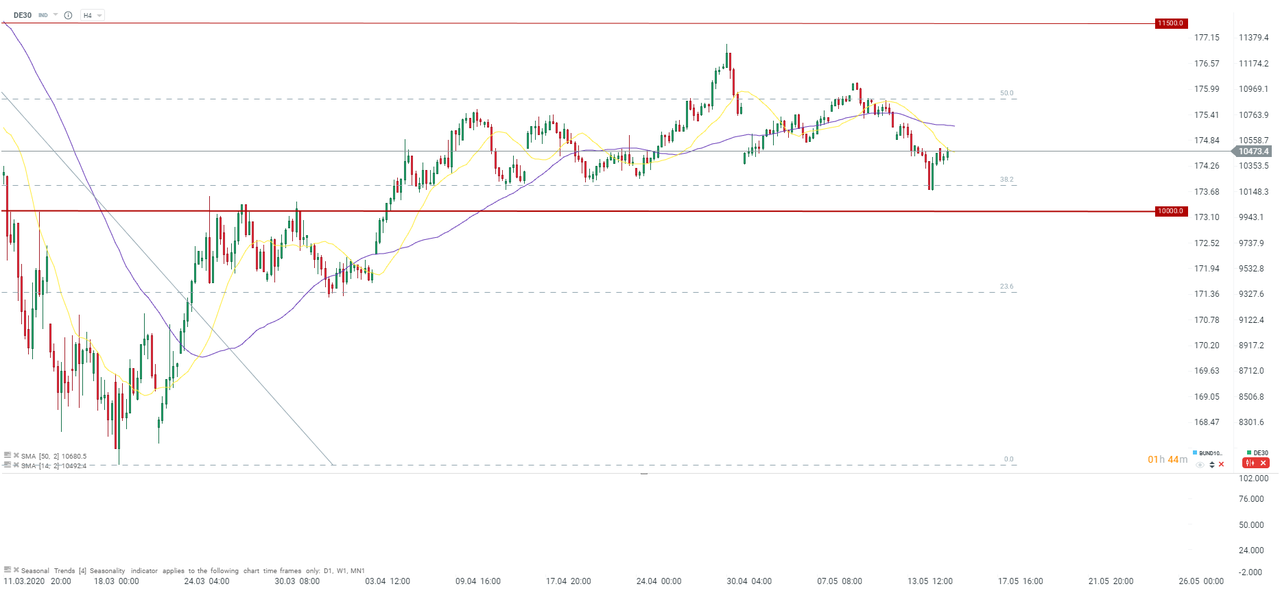 DAX przymiesza się do atakus trefy podażowej powiązanej ze średnimi ruchomymi oraz okolicą poziomu 10500 punktów. Widać, że słabe dane nie szkodzą zbytnio nastrojom wśród inwestorów. Źródło: xStation5