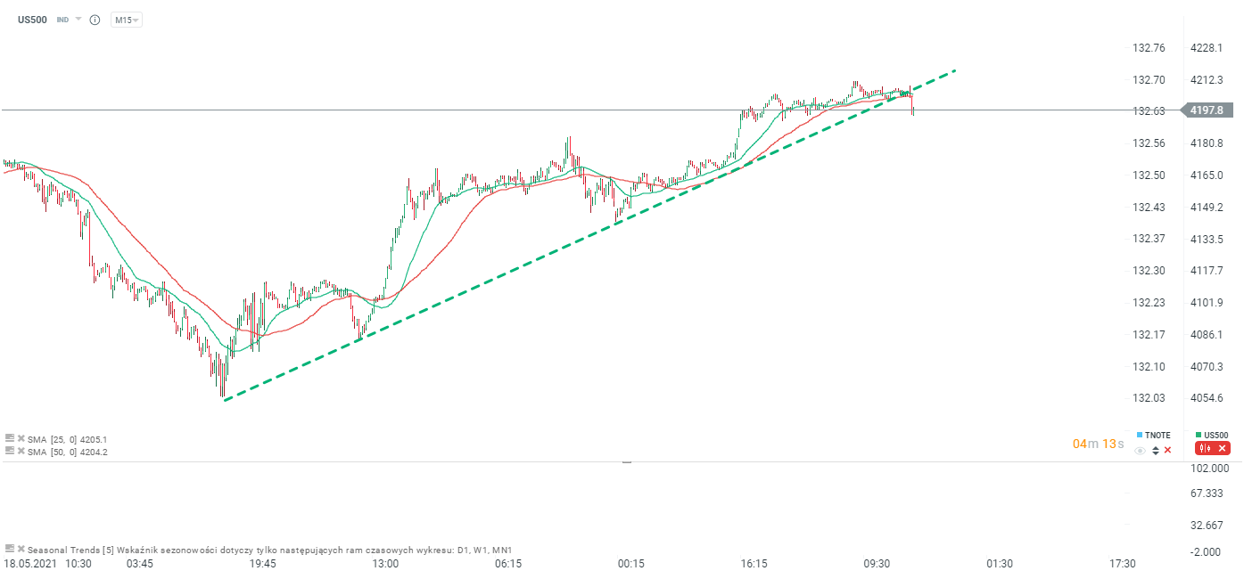 Dane odbierane są negatywnie przez inwestorów. US500 poniżej wzrostowej linii trendu, choć oczywiście mamy w tym wypadku krótki termin (M15). Najbliższe ważniejsze wsparcie to okolice poziomu 4180 punktów. Źródło: xStation5
