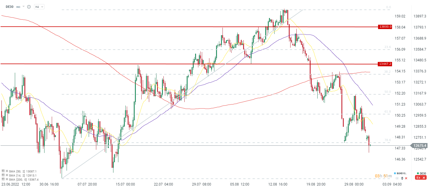DAX reagował słabo na odczyty i obserwowaliśmy spadki. Dopiero w ostatniej godzinie przed południem udało się nieco odrobić straty. DE30 utrzymuje się jednak poniżej zniesienia 78.6 całej fali wzrostowej rozpoczętej na przełomie czerwca i lipca.