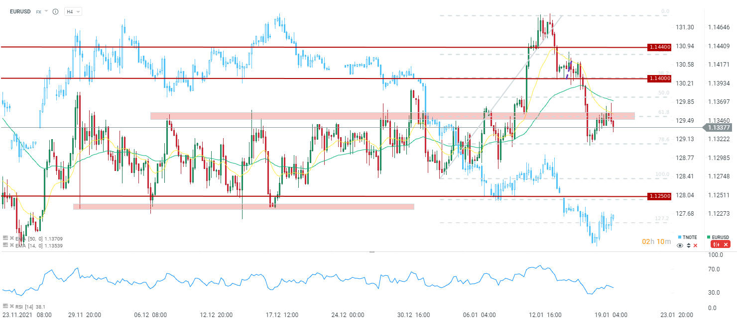EURUSD minimalnie odbiło po minutes. NIemniej warto zauważyć, że wcześniejsze próby ożywienia na EURUSD zostały zdławione przy strefie wynikającej z dwóch średnich kroczących na wykresie H4. Źródło: xStation5