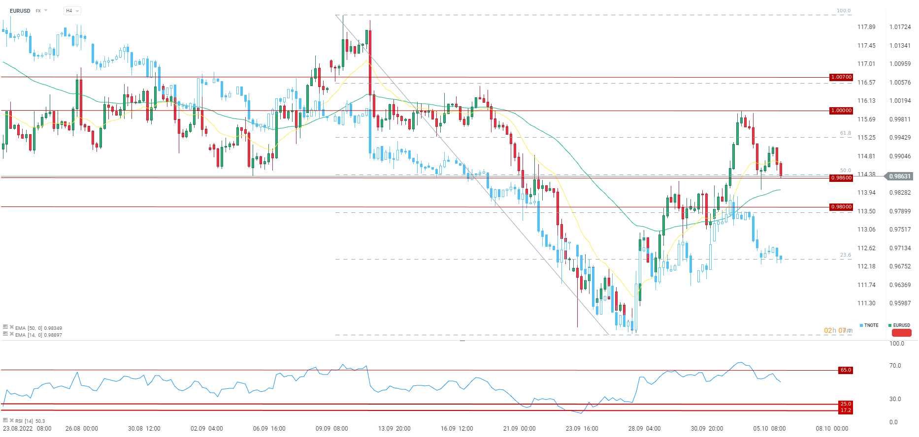 EURUSD ponownie testuje ważne miejsce wsparcia, które wczoraj powstrzymało dalsze spadki na parze. Dzisiaj może jednak dojść do przełamania i testu średniej 50 okresowej. Źródło: xStation5