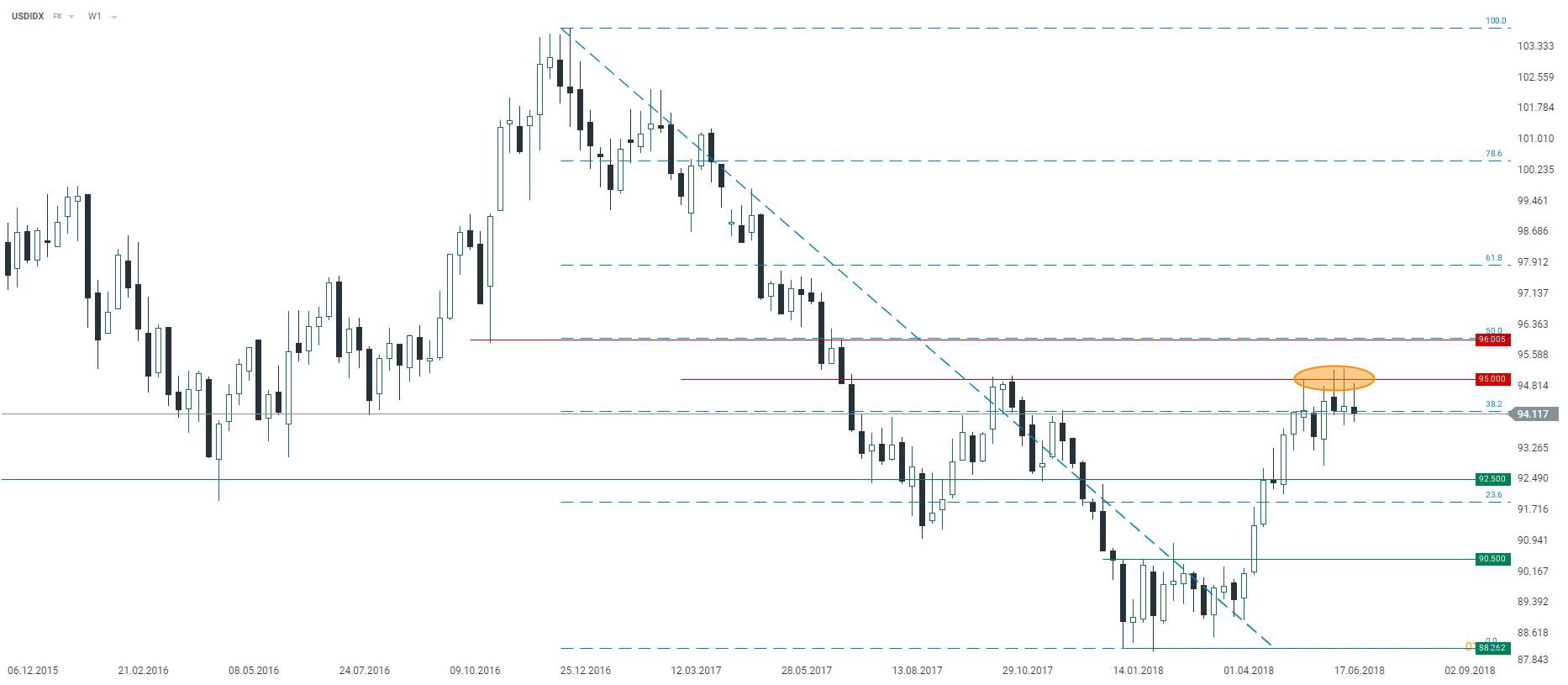 Indeks dolara w dalszym ciągu znajduje się poniżej krytycznego oporu i konsoliduje się powyżej 94 punktów. Pomimo ogólnie dobrych podstaw dla dalszego umocnienia amerykańskiego dolara widać, że byki powoli wyczerpują swoje siły. Źródło: xStation5