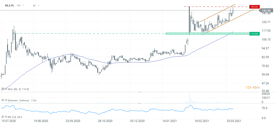 Patrząc na wykres dzienny, notowania sięgnęły dziś górnego ograniczenia lokalnego kanału wzrostowego przy 150 zł - jest to jednocześnie maksimum (i kurs otwarcia) z dnia 12 lutego. Jak widać, poziom ten pełni obecnie funkcję ważnego oporu. Kurs nieznacznie się już wycofał, jednak nadal rośnie o około 6%. Strefa w okolicach 114 zł pozostaje ważnym wsparciem. W najbliższych dniach celem dla byków może być utrzymanie się w kanale wzrostowym i ostatecznie wybicie w górę wspomnianego poziomu 150 zł. Spadek poniżej dolnego ograniczenia kanału mógłby z kolei spowodować potencjalną wyprzedaż w kierunku 114 zł.