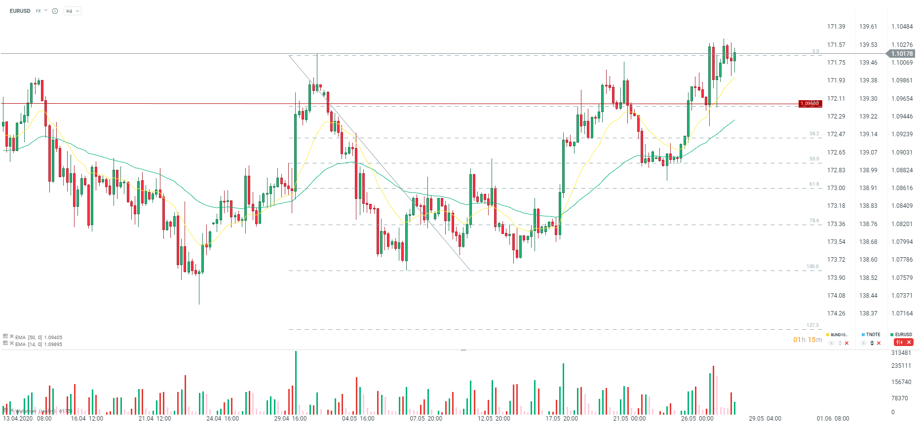 EURUSD pozostaje wysoko po publikacji całej paczki danych z USA i próbuje wybić się z konsolidacji ograniczonej od góry poziomem 1,1030. Źródło: xStation5
