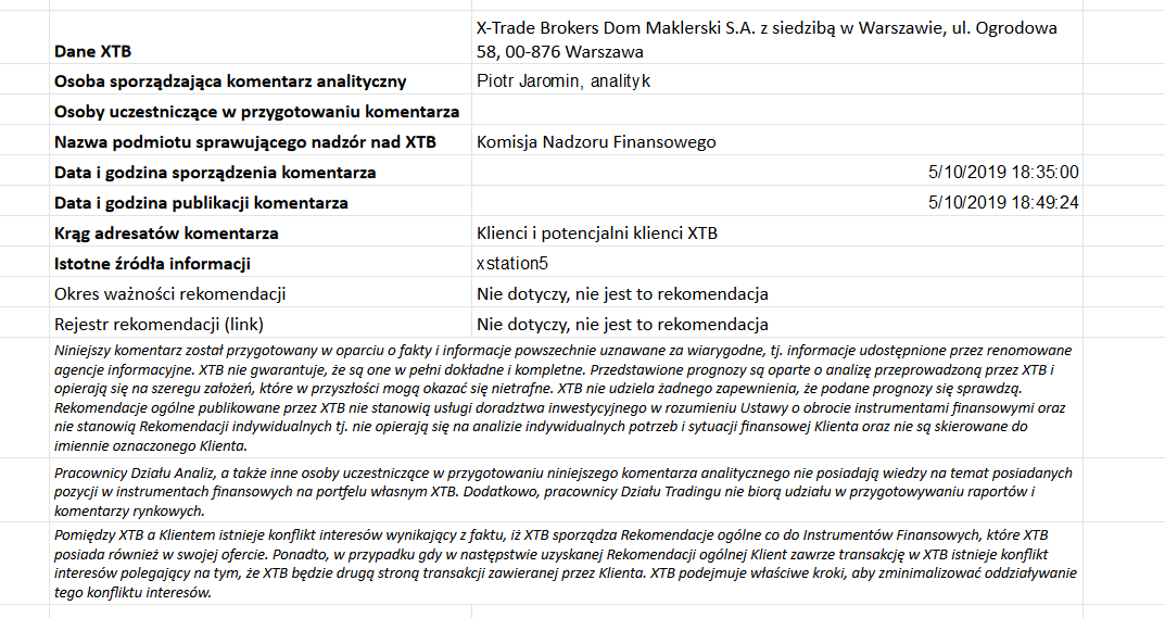 Ta publikacja handlowa jest informacyjna i edukacyjna. Nie jest rekomendacją inwestycyjną ani informacją rekomendującą lub sugerującą strategię inwestycyjną. W materiale nie sugerujemy żadnej strategii inwestycyjnej ani nie świadczymy usługi doradztwa inwestycyjnego. Materiał nie uwzględnia indywidualnej sytuacji finansowej, potrzeb i celów inwestycyjnych klienta. Nie jest też ofertą sprzedaży ani subskrypcji. Nie jest zaproszeniem do nabycia, reklamą ani promocją jakichkolwiek instrumentów finansowych. Publikację handlową przygotowaliśmy starannie i obiektywnie. Przedstawiamy stan faktyczny znany autorom w chwili tworzenia dokumentu. Nie umieszczamy w nim żadnych elementów oceniających. Informacje i badania oparte na historycznych danych lub wynikach oraz prognozy nie stanowią pewnego wskaźnika na przyszłość. Nie odpowiadamy za Twoje działania lub zaniechania, zwłaszcza za to, że zdecydujesz się nabyć lub zbyć instrumenty finansowe na podstawie informacji z tej publikacji handlowej. Nie odpowiadamy też za szkody, które mogą wynikać z bezpośredniego czy też pośredniego wykorzystania tych informacji. Inwestowanie jest ryzykowne. Inwestuj odpowiedzialnie.
