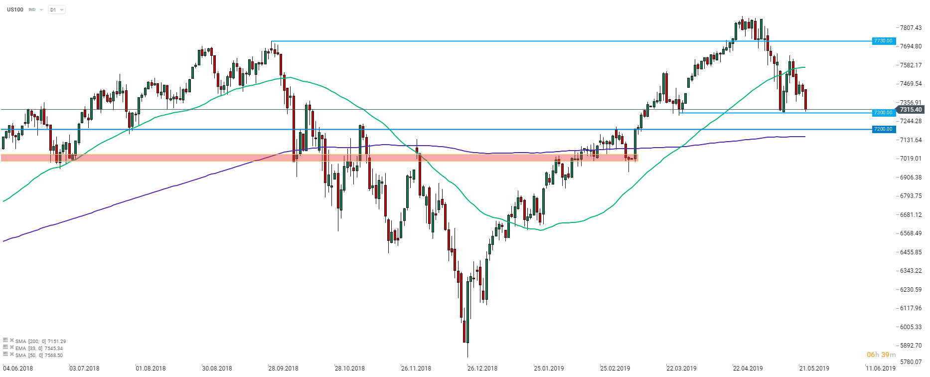 Indeks Nasdaq (US100) notuje bardzo silny spadek w pierwszej połowie czwartkowej sesji na Wall Street. Indeks testuje poziom 7300 pkt, wyznaczany przez ostatnie lokalne dołki. Warto zwrócić uwagę, że wykres US100 zaczyna przypominać formację głowy z ramionami z linią szyi właśnie przy 7300 pkt. Źródło: xStation5