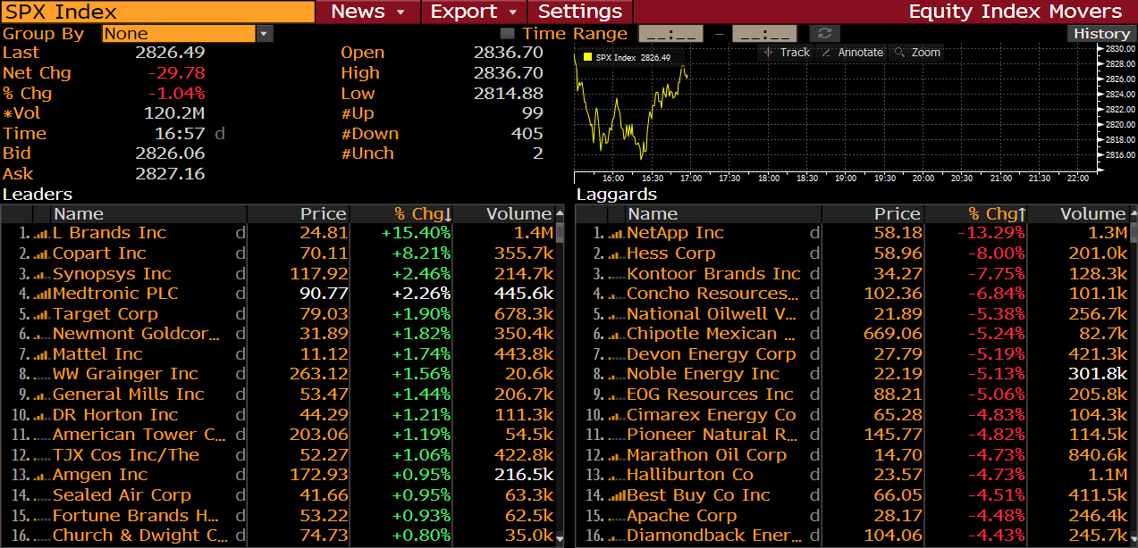 Spółki z indeksu S&P o godzinie 16:57. Źródło: Bloomberg