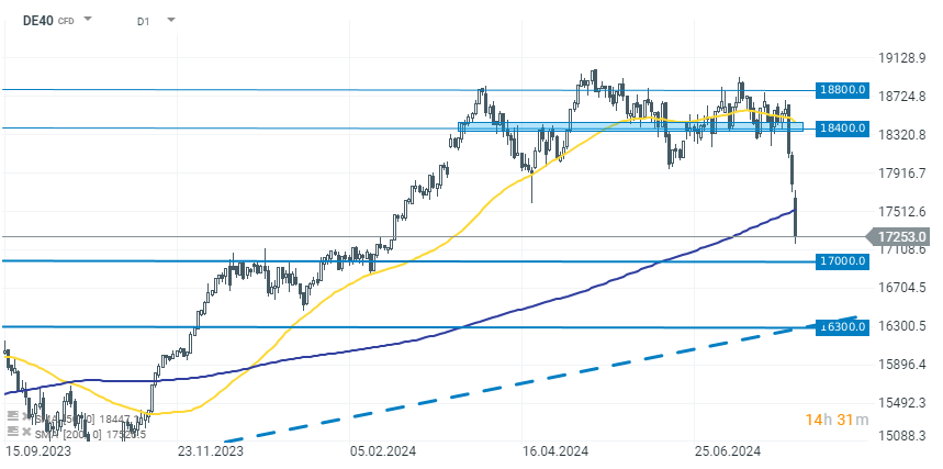 Kontrakty terminowe na niemiecki indeks DAX spadły o 2,85% do 17 250 punktów. Z perspektywy analizy technicznej najbliższym poziomem wsparcia jest strefa 17 000 punktów. W ciągu trzech dni handlowych DAX zanotował już spadek o prawie 8%. Warto zauważyć, że mamy przebicie średniej 200 okresowej, która wcześniej przełamana była spadkowo niemal rok temu. Obecnie obserwujemy DE40 najniżej od lutego.