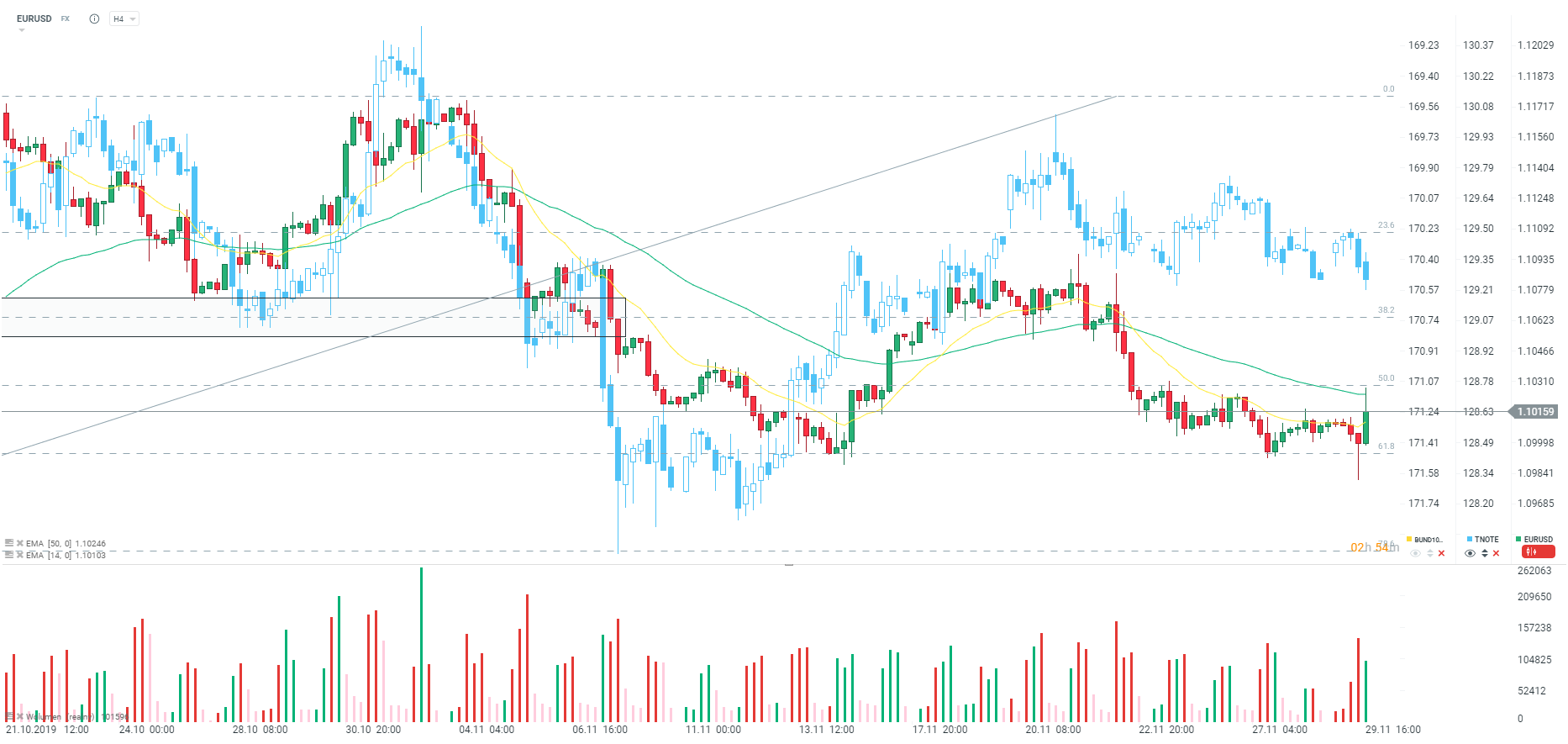 Para EURUSD zeszła dzisiaj poniżej poziomu 1,1000, ale później obserwowaliśmy odbicie do okolic poziomu 1,1020. Widać reakcje podażową na górne ograniczenie strefy podażowej związanej ze średnią 50 okresową oraz zniesieniem 50.0. Co więcej, obserwujemy domykanie się dywergencji z TNOTE'ami.