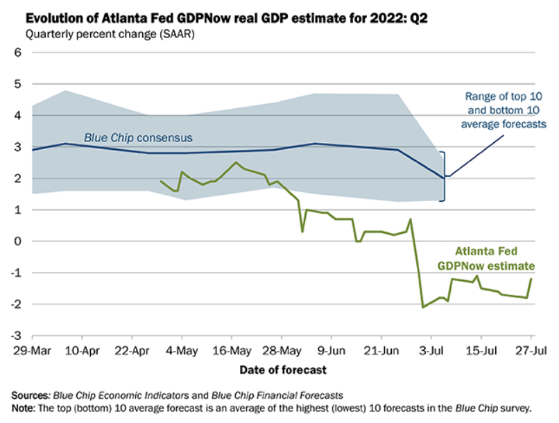 Model GDPNow pokazuje ostatecznie, że drugi kwartał przyniósł -1,2% zmiany PKB. Oczywiście jest to prognoza ilościowa! Jak widać 10 najlepszych prognoz ze strony instytucji wskazuje na 2%, choć tak prognoza była dostępna na początek lipca. Obecnie konsensus Bloomberga wskazuje na 0,8% w tempie annualizowanym. Najlepsza prognoza wskazuje nawet na 3,5% wzrostu, natomiast najgorsza na -2,1%.