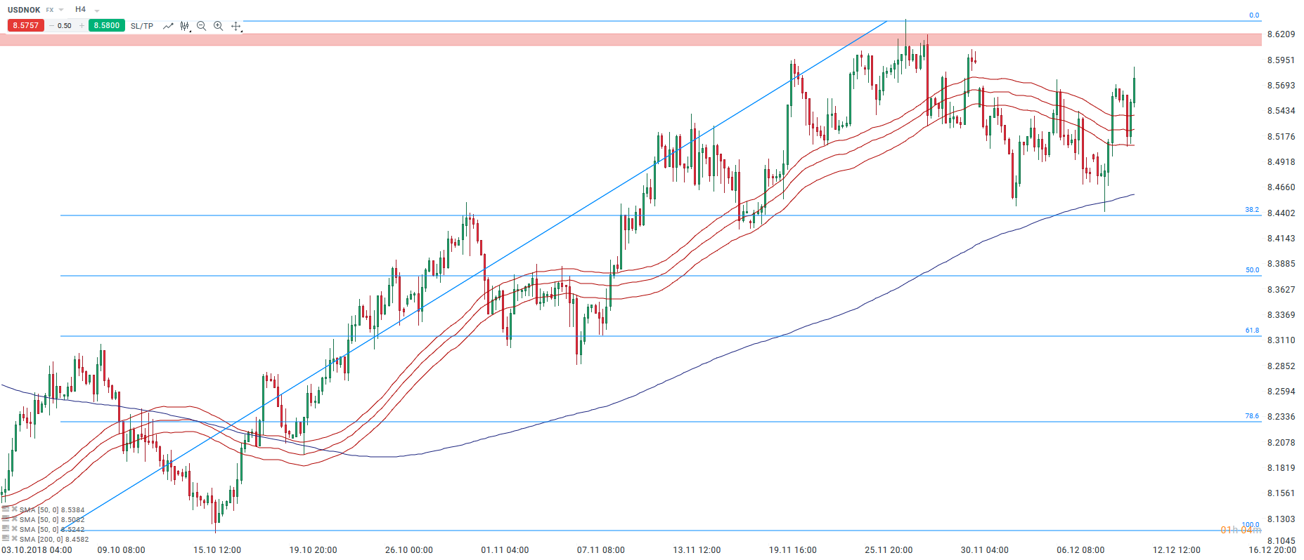 USDNOK ponownie zbliża się do testowanych ostatnio okolic 8,62. Korona norweska w ostatnim czasie cierpiała z powodu spadających cen ropy, a możliwe odbicie "czarnego złota" w najbliższym czasie mogłoby przynieść większą falę spadkową. Przeszkodą może być umacniający się ostatnio ponownie amerykański dolar, a wybicie 1,13 na parze EURUSD może być sygnałem do testu wspomnianej wcześniej strefy oporowej.
