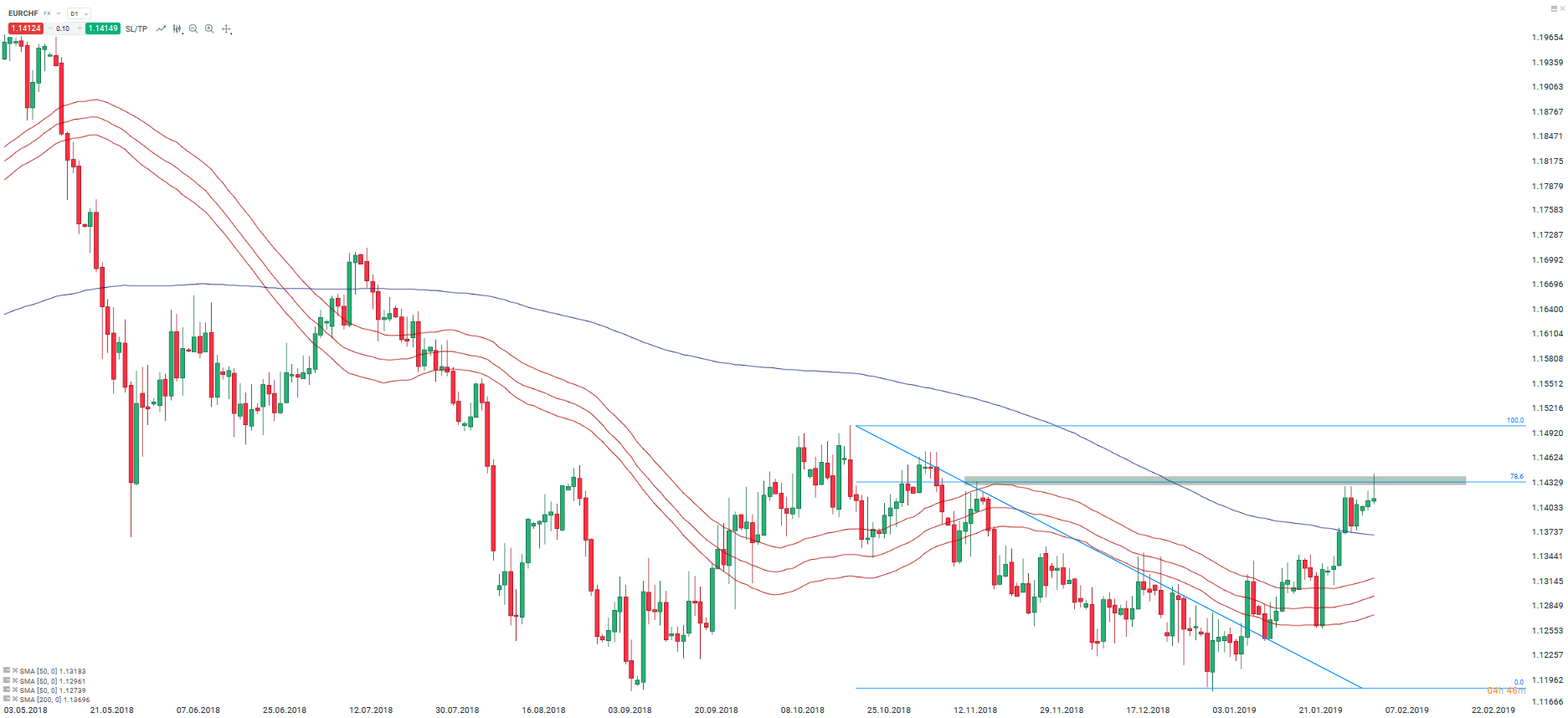 EURCHF po wybiciu średniej 200-sesyjnej dotarł do bardzo ważnego oporu na poziomie zniesienia 78,6%. W tym miejscu znajduje się również lokalne maksimum z listopada. Jak widać byki po porannej przewadze oddają plac boju, a na wykresie dziennym rysuje nam się świeca z długim górnym cieniem, co może zwiastować nadejście podaży w najbliższych dniach. Źródło: xStation5.
