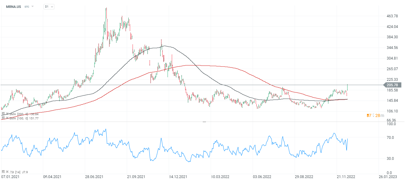 Akcje Moderny (MRNA.US), interwał D1. Akcje Moderny zareagowały potężnym wzrostem na informacje o potencjalnej szczepionce na raka. Średnie SMA200 (czerwony) i SMA100 (czarny) zbliżyły się do byczego przecięcia znanego jako 'złoty krzyż'. Walory wciąż notowane są z blisko 60% dyskontem wobec szczytów z jesieni 2021 roku. Źródło: xStation5