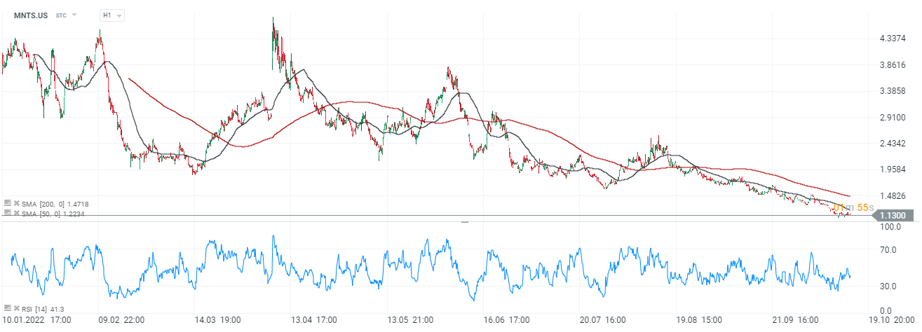 Akcje Momentus (MNTS.US), interwał H1. Cena akcji znajduje się pod presją spadkową i wydaje się, że tak długo dopóki cena trwale nie przekroczy poziomó SMA 200, w okolicach 1,5 USD ciężko mówić o odwróceniu trendu. Kapitalizacja rynkowa spółki jest niższa od 100 mln USD, wskaźnik ceny do wartości księgowej jest zdrowy i oscyluje w okolicach 1,1 punktu. Zadłużenie spółki jest relatywnie niewielkie, debt to equity ratio wynosi 0,32 co znaczy, że na 1 dolarów aktywów firmy przypada 0,32 USD długu. Źródło: xStation5