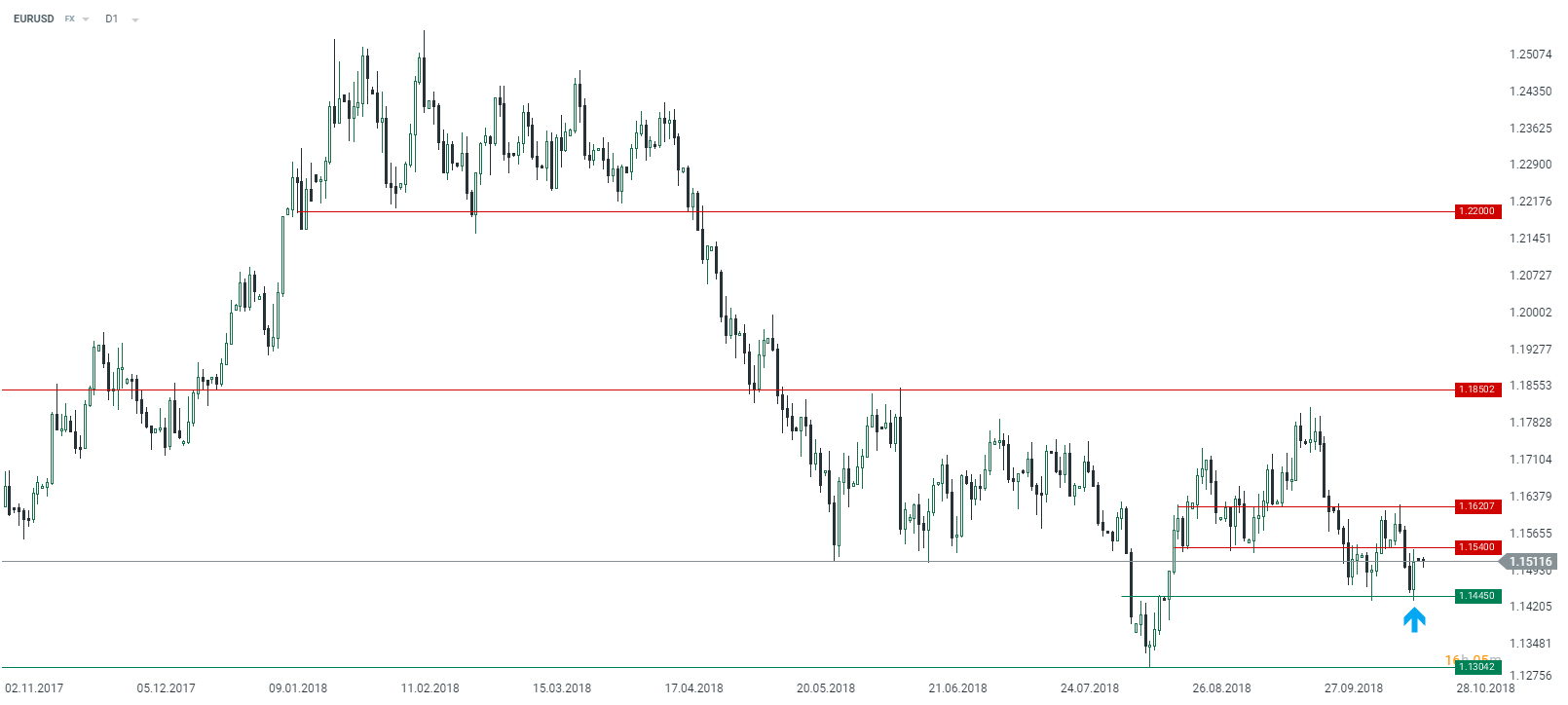 EURUSD jest handlowane na neutralnych poziomach w poniedziałkowy poranek. Para utrzymuje się powyżej 1.1445, co dobrze wróży na przyszłość. Kolejne poziomy, które można traktować jako potencjalne opory to: 1.1540 i 1.1620. Źródło: xStation5.