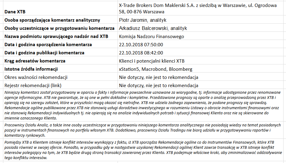 Ta publikacja handlowa jest informacyjna i edukacyjna. Nie jest rekomendacją inwestycyjną ani informacją rekomendującą lub sugerującą strategię inwestycyjną. W materiale nie sugerujemy żadnej strategii inwestycyjnej ani nie świadczymy usługi doradztwa inwestycyjnego. Materiał nie uwzględnia indywidualnej sytuacji finansowej, potrzeb i celów inwestycyjnych klienta. Nie jest też ofertą sprzedaży ani subskrypcji. Nie jest zaproszeniem do nabycia, reklamą ani promocją jakichkolwiek instrumentów finansowych. Publikację handlową przygotowaliśmy starannie i obiektywnie. Przedstawiamy stan faktyczny znany autorom w chwili tworzenia dokumentu. Nie umieszczamy w nim żadnych elementów oceniających. Informacje i badania oparte na historycznych danych lub wynikach oraz prognozy nie stanowią pewnego wskaźnika na przyszłość. Nie odpowiadamy za Twoje działania lub zaniechania, zwłaszcza za to, że zdecydujesz się nabyć lub zbyć instrumenty finansowe na podstawie informacji z tej publikacji handlowej. Nie odpowiadamy też za szkody, które mogą wynikać z bezpośredniego czy też pośredniego wykorzystania tych informacji. Inwestowanie jest ryzykowne. Inwestuj odpowiedzialnie.