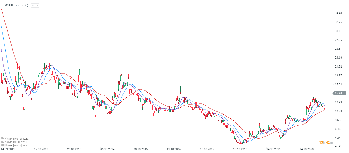 Mostostal Płock to spółka budowlano-montażowa, która należy do grupy kapitałowej Mostostal Warszawa. Pozostałe spółki z tej grupy też zaliczają dzisiaj spore wzrosty, choć nie tak gigantyczne jak w przypadku spółki z Płocka. MSP.PL zyskuje dzisiaj ponad 30% i w pewnym momencie akcje spółki notowane były powyżej lokalnych maksimów z marca tego roku, co spowodowało, że akcje notowane były najwyżej od 2017 roku.
