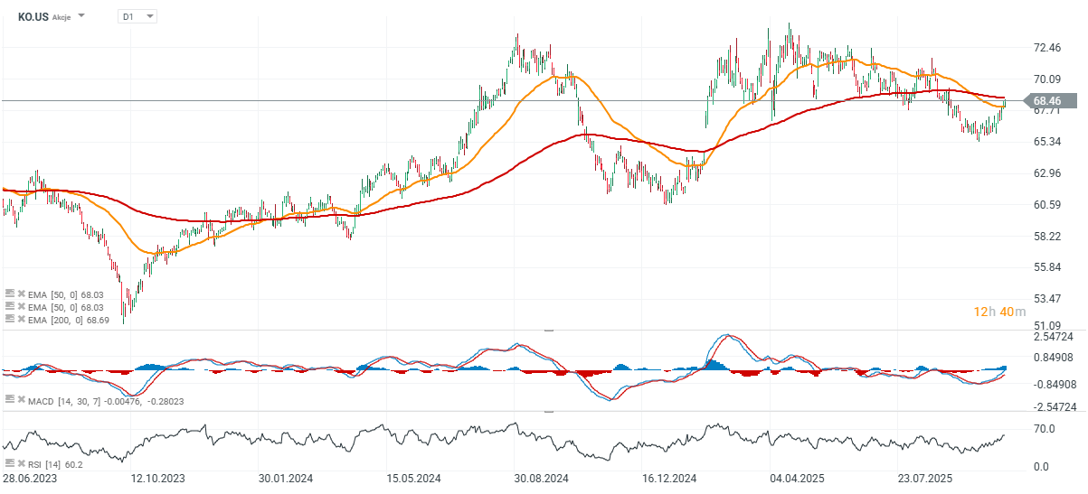 Akcje spółki zbliżają się do testu EMA200 (czerwona linia). Jeśli wyniki okażą się mocniejsze, od prognoz możemy uznać poziom 69 USD za symboliczny poziom graniczny, którego wybicie sugerowałoby możliwą zmianę trendu.