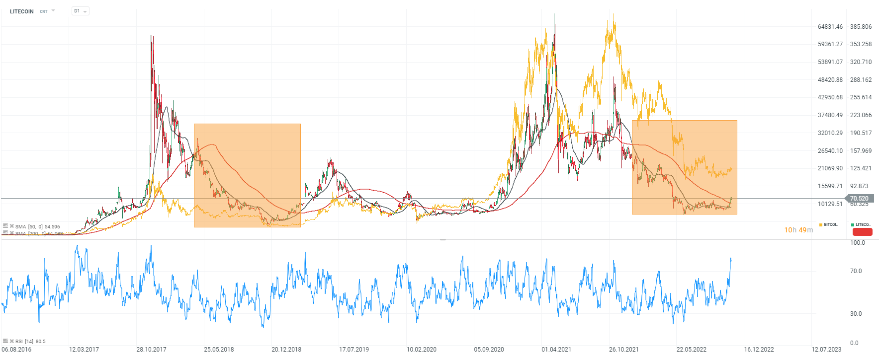 Wykres Litecoina, interwał D1. Kryptowaluta porusza się w trendzie spadkowym z którego w ostatnim czasie wybiła dynamiczniej od samego Bitcoina, dodając blisko 30% w ciągu ostatnich kilku dni. Warto zwrócić uwagę na okresy zaznaczone pomarańczowym polem. Okresy te pokrywają się z bessą rynku kryptowalut oraz liczone są od 'krzyża śmierci' do 'złotego krzyża' tj. znanej formacji przecięcia średnich kroczących 50 i 200 dniowych. Gdy popatrzymy na obie średnie obecnie (czarny i czerwony), zobaczymy, że zmierzają do przecięcia, które w przeszłości zwiastowało dłuższe odreagowanie. Bycze przecięcie mógłby powstrzymać wyłącznie nagły spadek ceny Litecoina. Źródło: xStation5