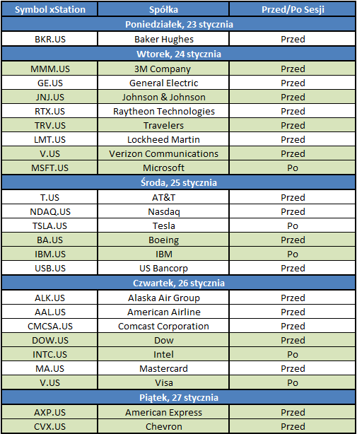 Sezon publikacji wyników spółek z Wall Street nabiera tempa. W tym tygodniu inwestorzy będą mieli okazję przyjrzeć się wynikom kilku dużych spółek technologicznych, takich jak na przykład Microsoft (wtorek), Tesla (środa) czy Intel (czwartek). W sumie 12 spółek z Dow Jones przedstawi raporty (zielone podświetlenie w tabeli poniżej), więc US30 może doświadczyć trochę zmienności w tym tygodniu. Harmonogram najważniejszych raportów w tym tygodniu prezentuje się następująco.