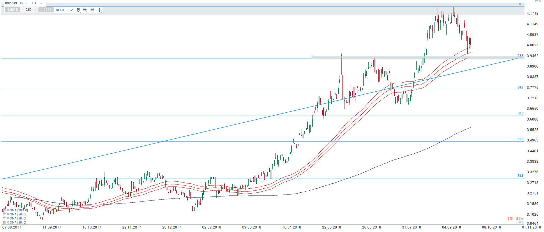 Już w niedzielę odbędą się wybory prezydenckie w Brazylii, co może mieć znaczący wpływ w najbliższym czasie na notowania brazylijskiego reala jak i kawy (Coffee). Wybory według wstępnych sondaży nie zakończą się pierwszą turą, a prawdopodobnymi kandydatami, którzy dostaną się do drugiej tury jest Jair Bolsanoro i Fernando Haddad. Bardziej pro-rynkowym kandydatem jest bez wątpienia Bolsanoro, lecz jego szanse wygranej w bezpośrednim starciu z Haddadem w drugiej turze wydają się mniejsze. Brazylijski real w stosunku do dolara amerykańskiego mocno tracił w tym roku, co zaprowadziło USDBRL w okolice maksimów z 2015 roku. Ważnym poziomem są z pewnością okolice 3,94, gdzie znajdują się lokalne szczyty z czerwca i lipca. Dodatkowo na tym poziomie mamy również zniesienie 23,6% całej fali wzrostowej od 2017 roku.