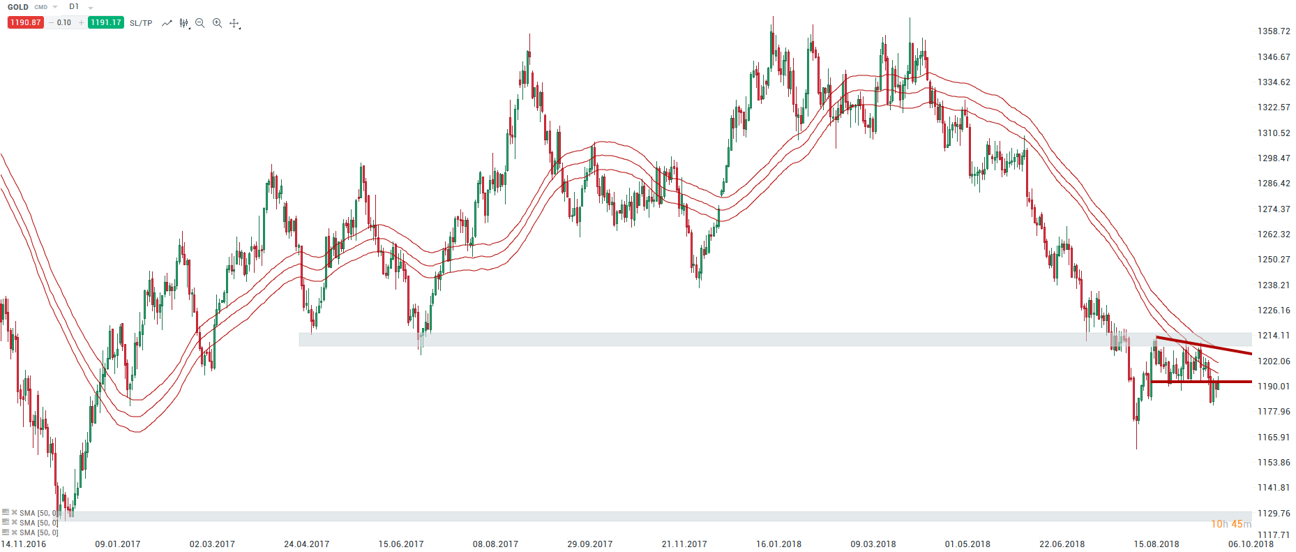 Bardzo ciekawie w ujęciu technicznym wygląda również złoto (Gold). W ostatnim czasie po posiedzeniu FOMC, dolar amerykański znów powrócił do sił. Wyprzedaż metali szlachetnych, która miała miejsce od kwietnia tego roku miała głównie związek z rosnącym na sile amerykańskim dolarem. Ostatnie umocnienie najważniejszej waluty świata, wciąż nie spowodowało większych ruchów na złocie, które pozostaje od kilku tygodni w wąskim zakresie zmienności pomiędzy 1185$ a 1215$ za uncję. Uspokojenie sytuacji, z którym mieliśmy do czynienia od połowy sierpnia nie spowodowało wyjścia powyżej kanału średnich 50-okresowych. Dodatkowo ostatnie ruchy można traktować jako ruch powrotny w kierunku wyłamanego wsparcia w okolicy 1215$ za uncję, gdzie zlokalizowane były minima z połowy lipca 2017 roku. Czy dolar amerykański wywrze ponownie presję na metale szlachetne?