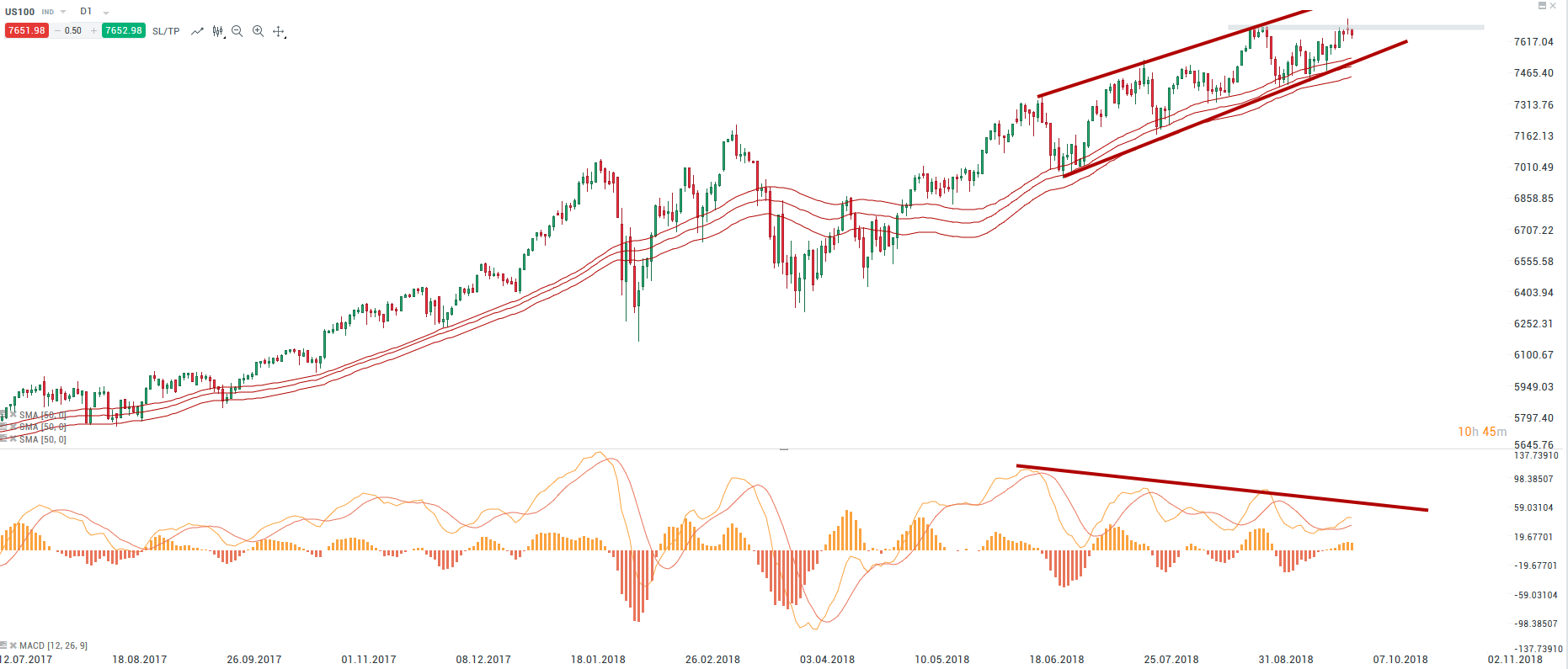 Indeks technologicznych - US100 zachowuje się ostatnio najgorzej spośród trzech głównych amerykańskich indeksów: US30, US500 i US100. Choć trzeci kwartał był dla rynku akcji w USA bardzo dobry, to obecnie kolejnym wyzwaniem dla spółek będzie spełnienie wysokich oczekiwań w stosunku do wyników kwartalnych za okres od lipca do września. Pierwsze raporty najważniejszych spółek z Wall Street już w przyszłym tygodniu, więc uwaga z pewnością będzie teraz skupiona głównie na wynikach amerykańskich przedsiębiorstw. Wczoraj na wykresie US100 ukształtowała nam się świeca z niskim korpusem i długimi cieniami, co biorąc pod uwagę nieudany test historycznych maksimów, może być pierwszym argumentem dla niedźwiedzi. Dodatkowo w szerszym ujęciu znajdujemy się w klinie zwyżkującym, a jego dolne ograniczenie przebiega obecnie w okolicach kanału średnich 50-okresowych. Od kilku tygodni rysuje nam się również potencjalna dywergencja pomiędzy wskaźnikiem MACD, a notowaniami US100 w postaci coraz wyższych szczytów indeksu, które nie znajdują potwierdzenie w wyższych szczytach MACD.