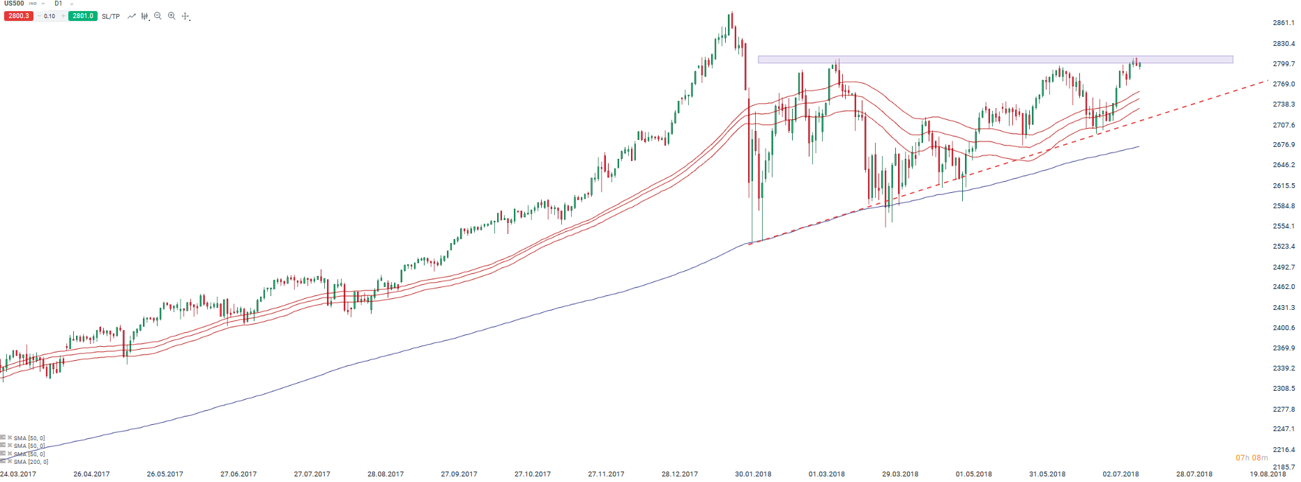 Indeks S&P500 zbliża się do poziomu 2800 pkt. Źródło: xStation5.