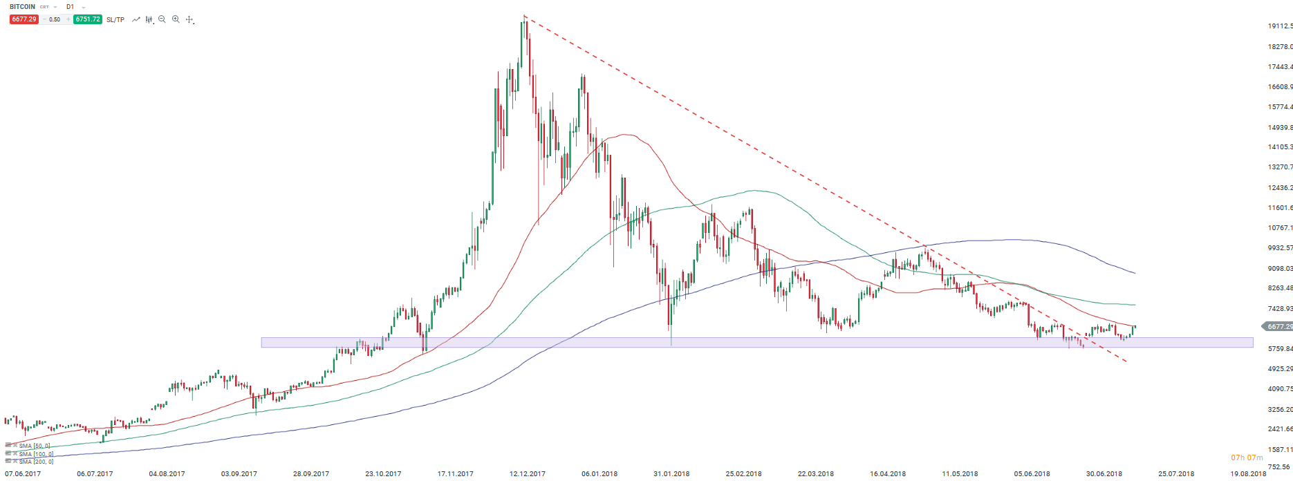 Ostatnim rynkiem na ten tydzień jest Bitcoin. Najważniejsza kryptowaluta w ostatnich miesiącach nie cieszyła się najlepszą passą. W ostatnich tygodniach obserwujemy jednak wyhamowanie spadków po dotarciu do wsparcia w okolicach okrągłego poziomu 6000 $. Na początku miesiąca wyłamana została także linia trendu spadkowego, która może sygnalizować, że zmiana rynkowego sentymentu w najbliższym czasie może być realnym scenariuszem. Obecnie kurs Bitcoina znajduje się na poziomie 50-okresowej średniej kroczącej. Niewiele wyżej mamy szczyty notowań z ostatniego tygodnia, które zlokalizowane są w okolicach 6750$. Wyłamanie tego poziomu pozwoliłoby przełamać negatywną strukturę niższych dołków i szczytów budowaną od początku maja. Jednak im dłużej kurs będzie utrzymywał się w okolicach ostatniego zakresu zmienności tym szanse byków na wyprowadzenie kontry powinny maleć.